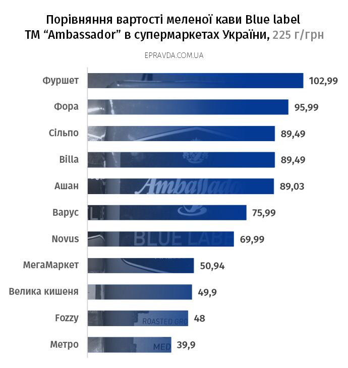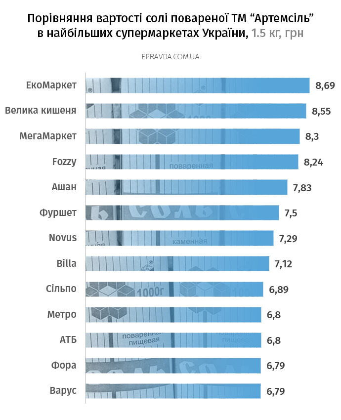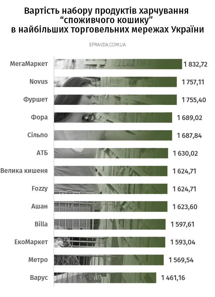 Стоимость месячной нормы питания, 55,5 кг пищи, колебалась от 1461 грн в «Варус» до 1833 грн в «Мегамаркет», а разница в стоимости набора продуктов «потребительской корзины» в самой дорогой и самой дешевой торговых сетях Украины достигает 25%.