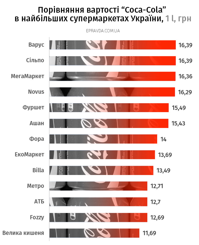 Чтобы проиллюстрировать насколько отличаются цены даже на одинаковые товары, предлагаем посмотреть, сколько стоит такой популярный продукт как Coca-Cola в различных сетях.