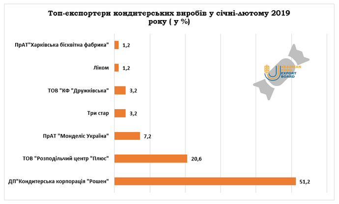 Безоговорочным лидером по экспорту кондитерских изделий в первые два месяца текущего года в этом сегменте стало ДП "Кондитерская корпорация "Рошен" (51,2%).