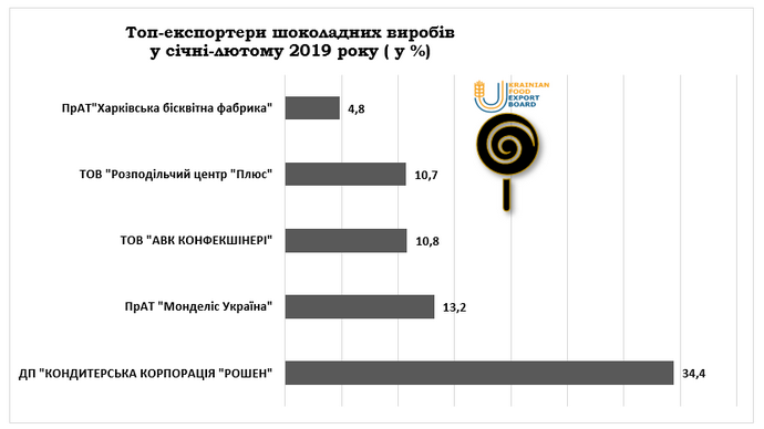 Лидирует в этом сегменте дочернее предприятие "Кондитерская корпорация" Рошен", обеспечив треть экспорта шоколадных изделий (34,4%).