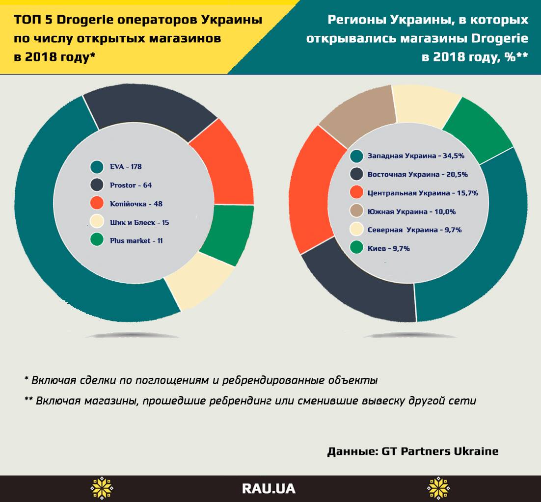 Достаточно любопытна и география открытий. Как и ведущие продовольственные операторы, топ-5 украинских сетей в сегменте drogerie основное внимание в прошлом году обратили на Западную Украину (по классификации GT Partners Ukraine — Волынская, Ровенская, Тернопольская, Львовская, Хмельницкая, Ивано-Франковская, Черновицкая, Закарпатская области). В период с января по декабрь 2018 года в этом регионе начало работать 34,5% всех новых объектов.