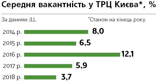 Из-за нехватки качественных торговых площадей показатель вакантности за прошлый год упал до рекордно низкого уровня. По данным компании JLL, после длительного уменьшение доли свободных площадей, что наблюдается два года подряд, в IV квартале 2018-го этот показатель стабилизировался на уровне 3,7% (см. “Средняя вакантность…”). Вместе с вакантностью стабилизировалась и стоимость аренды. “В первом полугодии прошлого года арендные ставки выросли на 20% и почти достигли докризисного уровня — $1,14 тыс. за 1 кв. м в год (или $95 за 1 кв. м в месяц), — отмечает Екатерина Весна, начальник отдела торговых площадей компании JLL (Украина). — До конца года арендные ставки стабилизировались”.