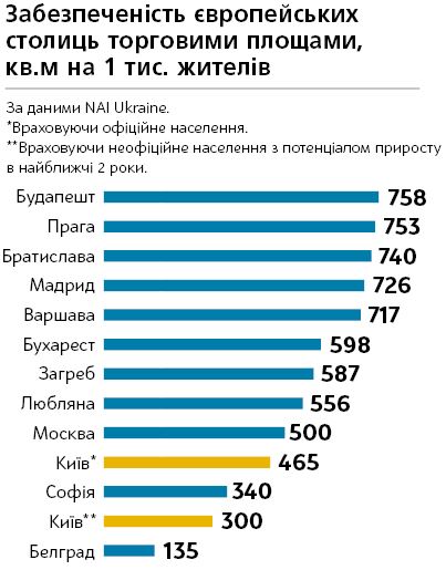 Бум открытия “торговых площадей” продолжается и в этом году: в январе в эксплуатацию введены еще два новых объекта — Smart Plaza Obolon и Oasis (суммарный GLA составляет почти 20 000 кв. м). Однако даже с учетом этих открытий Киев все еще далек от среднего европейского показателя насыщенности торговыми площадями. Если учитывать “официальное” население украинской столицы, на 1000 жителей приходится лишь 465 кв. м, а если подсчитать количество “неофициальных” киевлян с потенциалом прироста в ближайшие два года, то показатель уменьшится до 300 кв. м на тысячу жителей. Тогда как в столицах европейских соседей он вдвое больше (см. “Обеспеченность…”).
