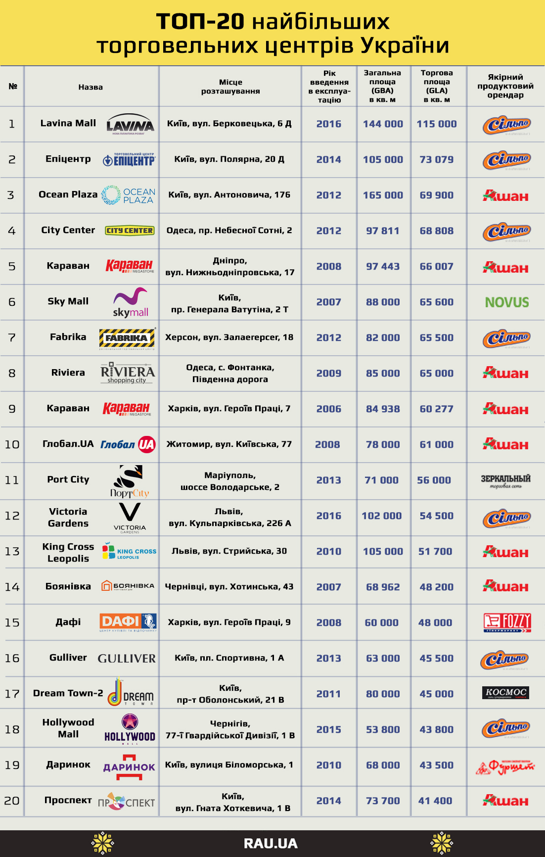 RAUпредставляет рейтинг крупнейших торговых центров Украины по арендной площади (GLA). В списке 20-ти крупнейших в Украине собраны объекты, которые подпадают под определение торгового центра по классификации ICSC — Международного совета торговых центров. Среди прочего, эта классификация предусматривает, что у торгового центра должно быть централизованное управление, основной якорный арендатор должен занимать не более 90% всей площади объекта, а минимальное количество лотов под аренду должно быть не менее 20.