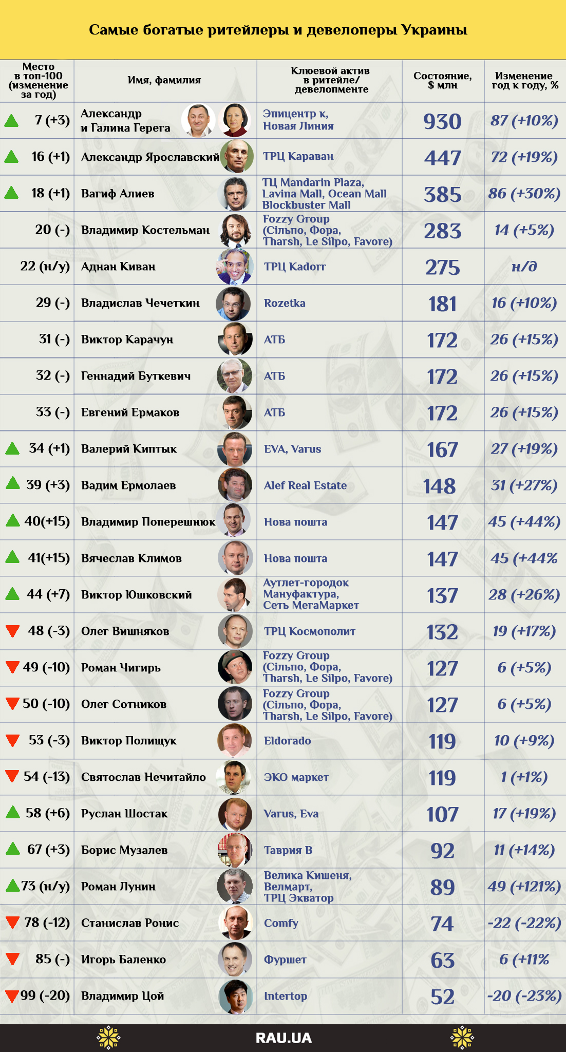 В целом, список ста богатейших украинцев довольно стабилен, и новые лица в нем появляются нечасто: в основном «все те же на манеже», а новички попадают в рейтинг только в порядке исключения. Тем не менее, топ-100 богатейших украинцев образца 2019 года принес несколько неожиданностей. RAU выбрала из списка бизнесменов, напрямую связанных со сферами ритейла и торговой недвижимости.