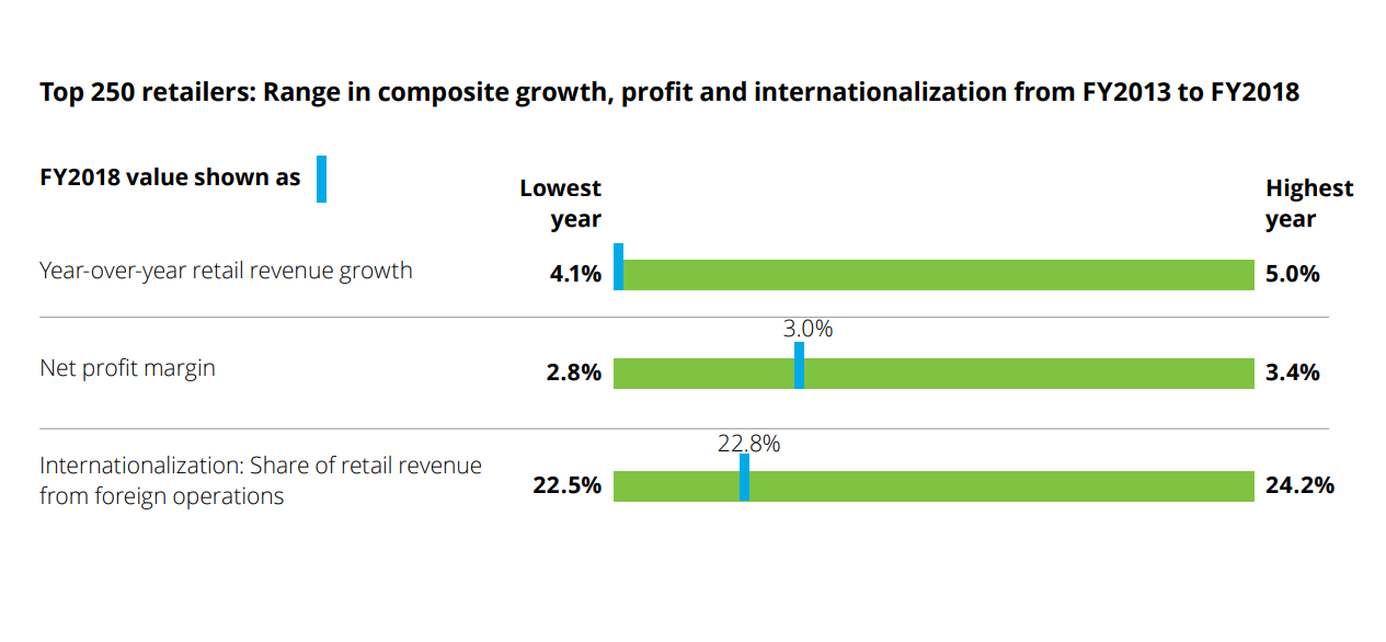 Cовокупный доход от розничной торговли для 250 крупнейших мировых ритейлеров в 2018 финансовом году (с 1 июля 2018 года по 30 июня 2019 года) достиг $4,74 трлн против 4,53 трлн в 2017 году. Однако на сей раз доходы росли медленнее: всего на 4,1% против 5,7% в предыдущий период.