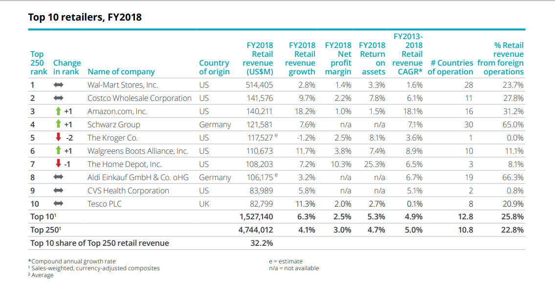 Топ-10 крупнейших ритейлеров остались те же, что и годом ранее, а значит в мировом ритейле продолжают доминировать американские корпорации (7 из 10). Но интернет-гигант Amazon и немецкая Schwarz Group (сети Lidl и Kaufland) продолжают карабкаться на вершину списка, тесня конкурентов. В этот раз не повезло сетям Kroger и The Home Depot.