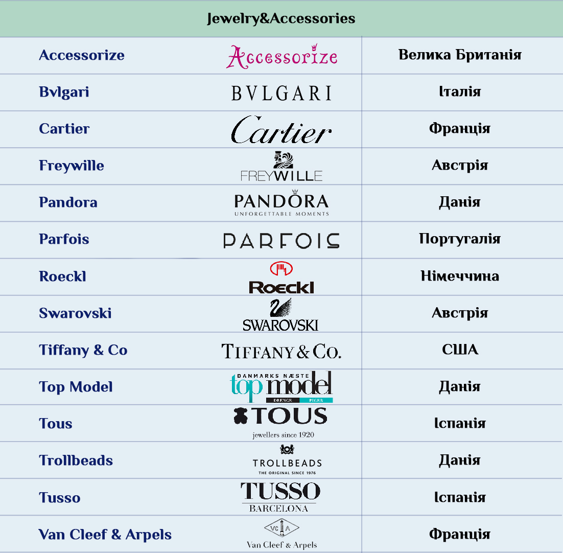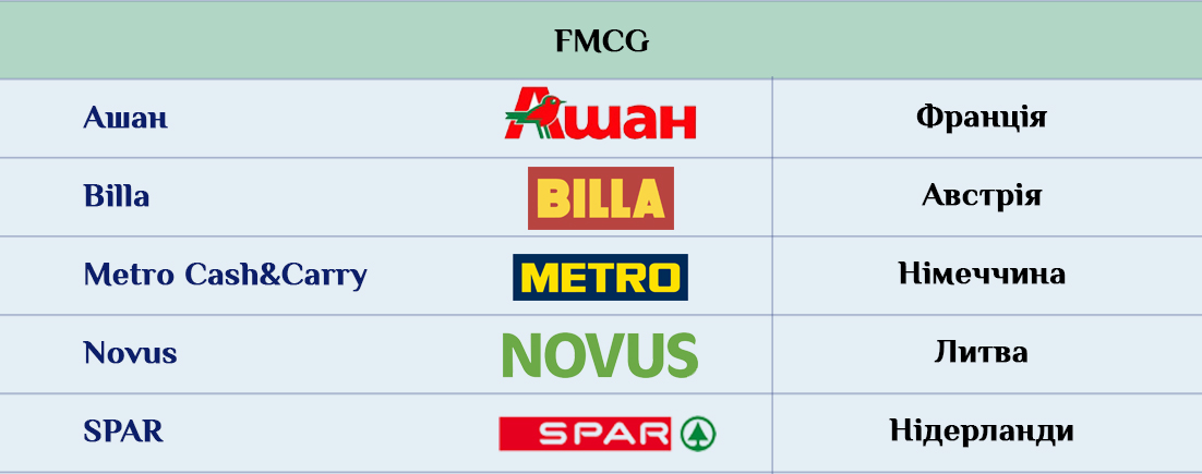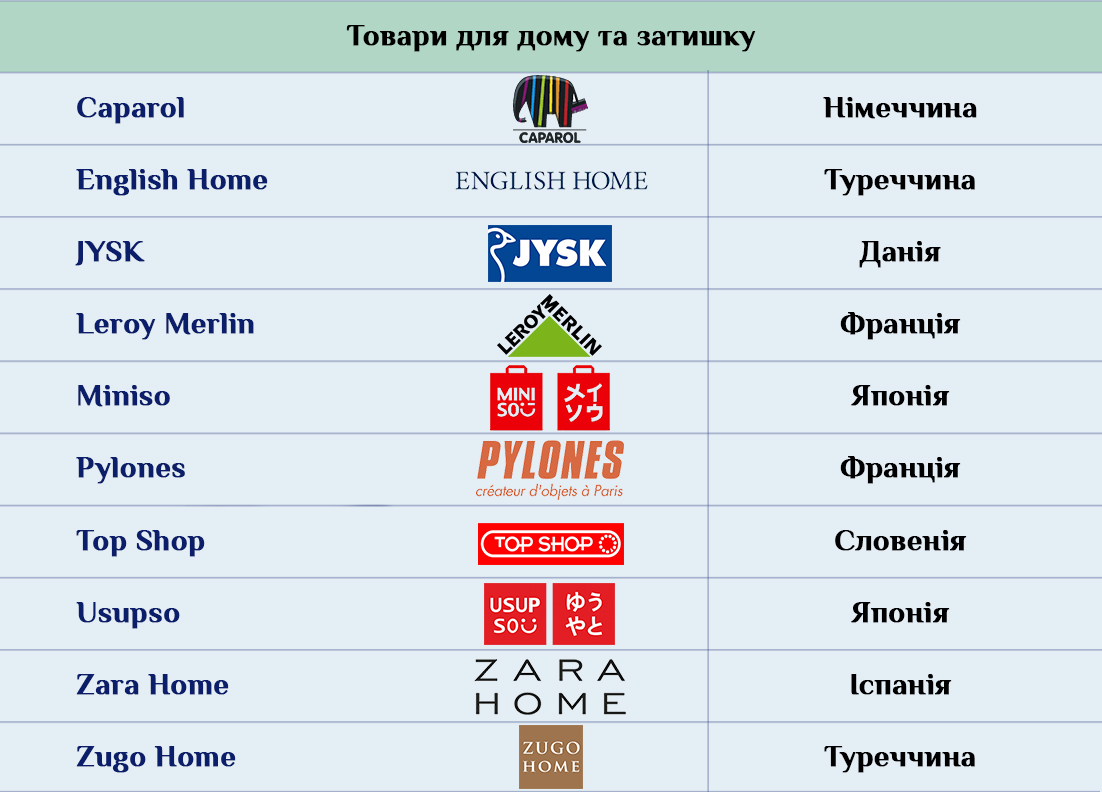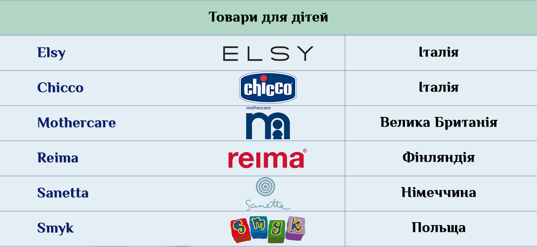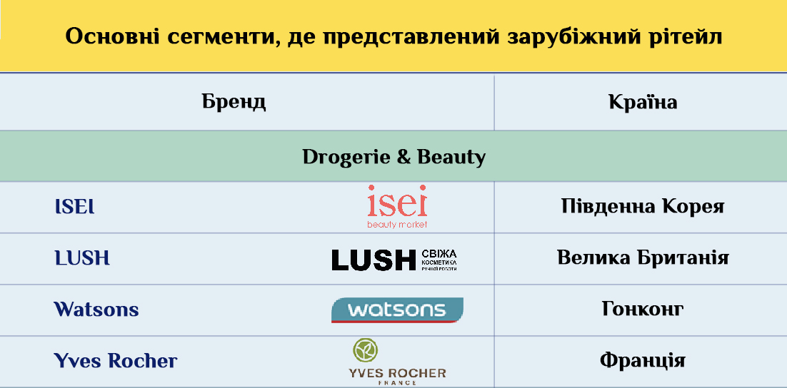 Остальные страны представлены либо сугубо одежными брендами, аксессуарами и парфюмерно-косметической продукцией, как например британские бренды. Либо отдельными представителями какого-то конкретного сегмента. Скажем, японские компании в Украине представлены товарами для дома в магазинах Miniso и Usupso, а Южная Корея – косметикой ISEI. Более разнопланово в Украине представлена, к примеру, Австрия с ее супермаркетами Billa и ювелирынми украшениями от Freywille и Swarovski.