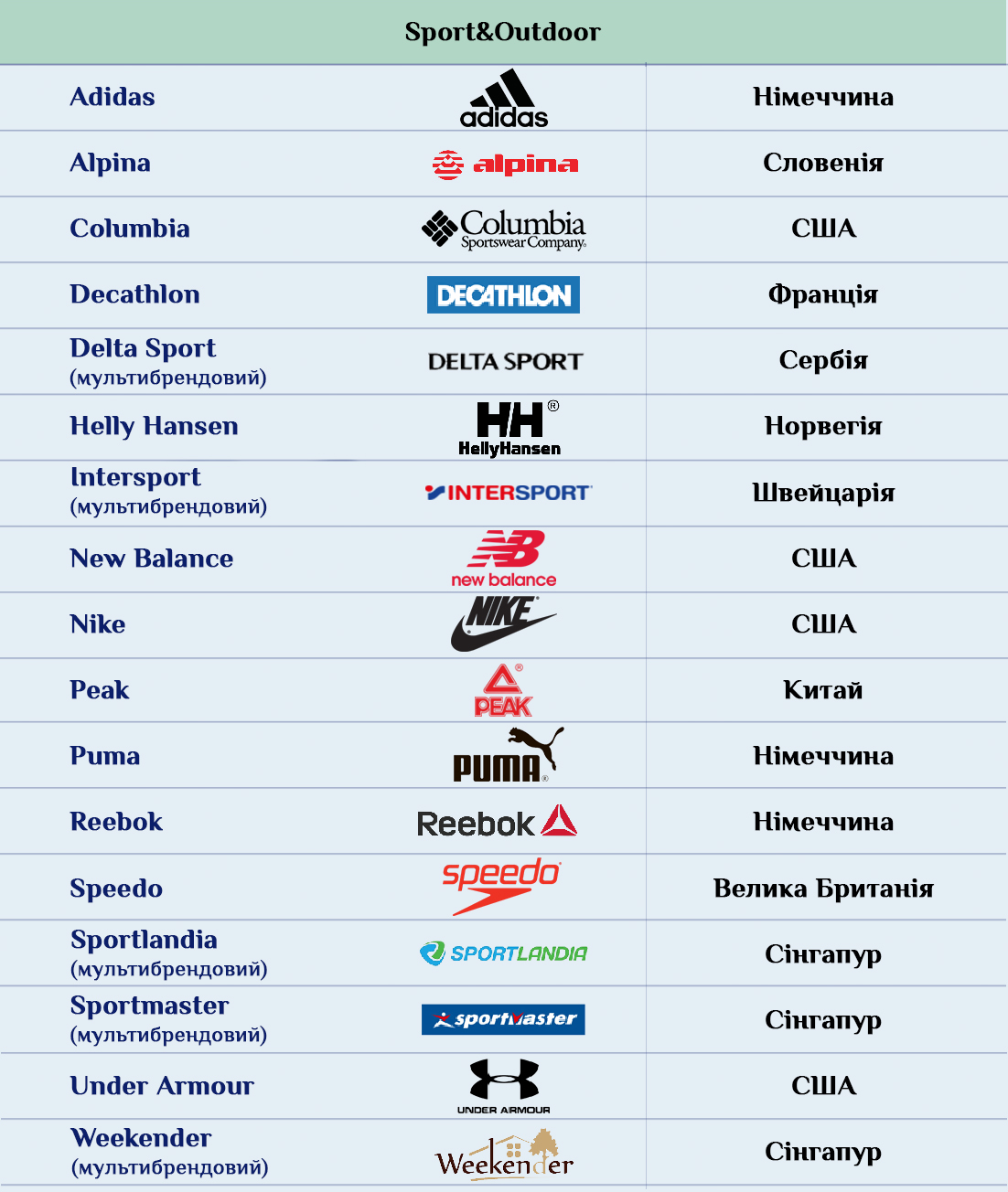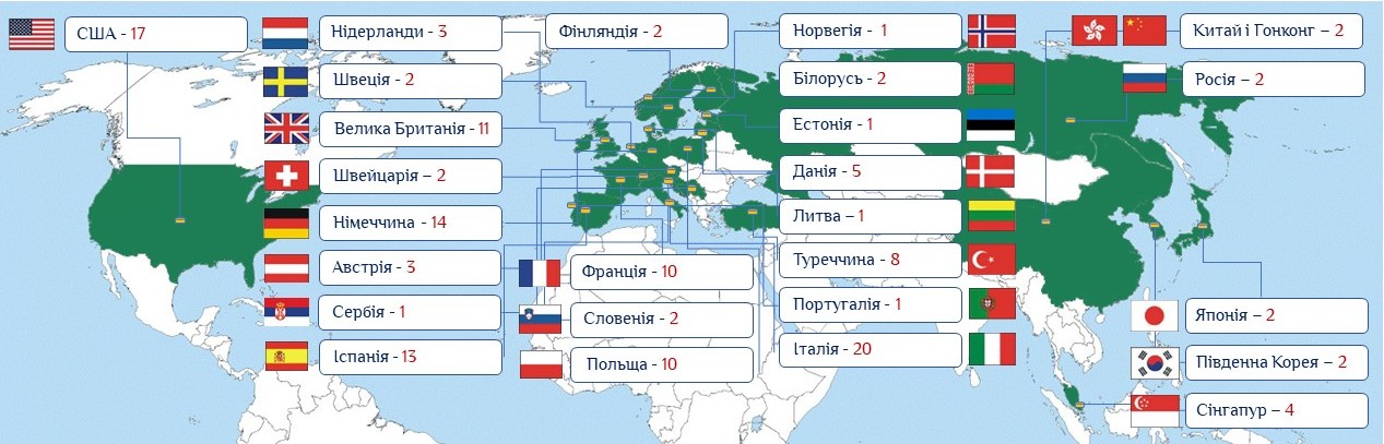 Примерно три четверти иностранных брендов в Украине – европейские марки. Наиболее массово представлены Италия (20 брендов), Испания и Германия (по 13 и 14 брендов соответственно). Однако на втором месте после Италии по количеству торговых марок находятся американские компании – целых 17. По десятку брендов — из Франции, Польши и Великобритании.