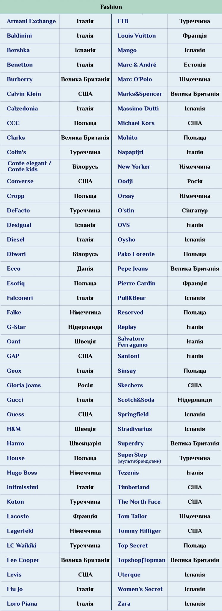 В большинстве случаев указана страна происхождения бренда, но в некоторых случаях – используется страна, резидентом которой выступает собственник торговой марки. Например, LC Waikiki — родом из Франции, но сейчас позиционируется новыми собственниками как турецкий бренд. Аналогично французкий бренд Lacoste контролируется швейцарской компанией, а в Украине представлен турецким холдингом Eren Perakende