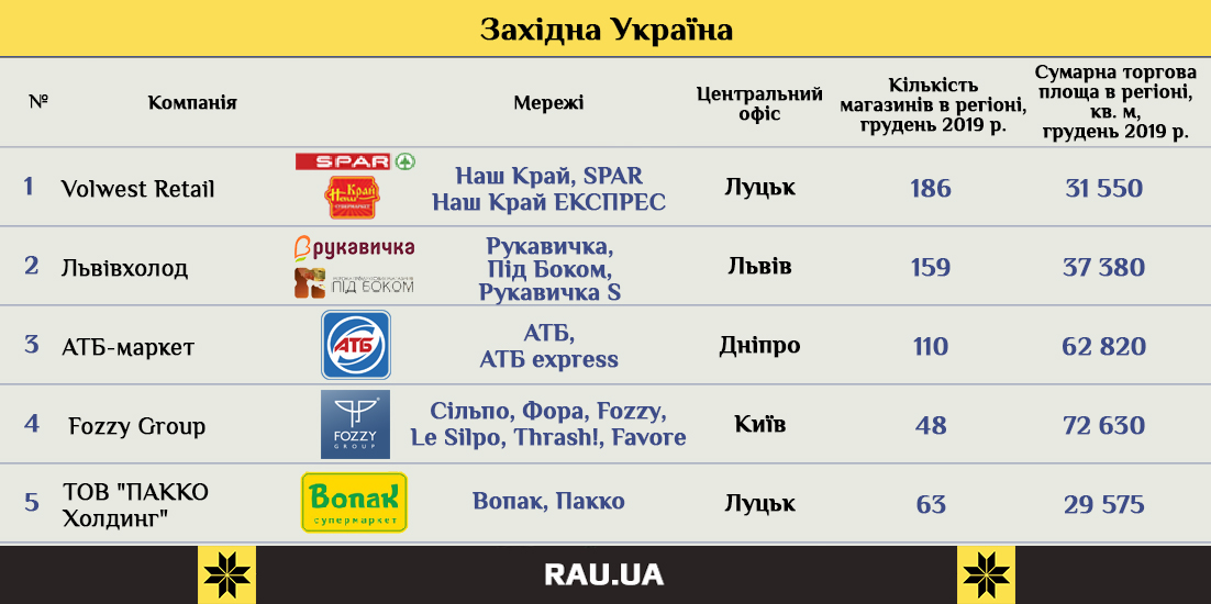 В западном регионе преобладают местные ритейлеры из Луцка и Львова. Пальму первенства по числу торговых точек удерживает Volwest Retail, развивающая сети Наш Край и Spar в формате супермаркета, магазина у дома и минимаркета.