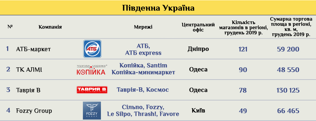 Оба местных игрока из Одессы и оба представлены разными форматами: супермаркет, магазин у дома, деликатес-маркет, минимаркет. Причем Таврия В примерно в два с лишним раза больше по площадям, чем все ее конкуренты. В том числе единственный киевский игрок — Fozzy, который именно в этом регионе открыл магазины Le Silpo, чтобы достойно конкурировать с местными деликатес-маркетами.