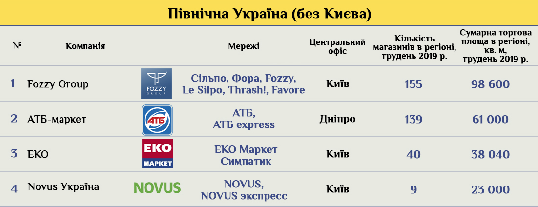В северных регионах страны, за исключением АТБ, в основном представлены сети с киевской пропиской, например, Novus, которая располагает девятью магазинами формата супер- и гиперпермаркет. А также два гипермаркета сети Мегамаркет общей площадью 16 740 кв. м.