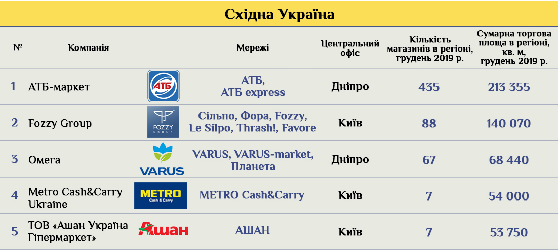 Примечательно, что в регионе расстановка сил по числу магазинов и объемам торговых площадей выглядит более равномерной. Возможно, потому что здесь основная битва идет между супер- и гипермаркетами. После Fozzy Group и АТБ тройку лидеров замыкает ЭКО маркет, который кроме перечисленных форматов также представлен магазинами у дома.