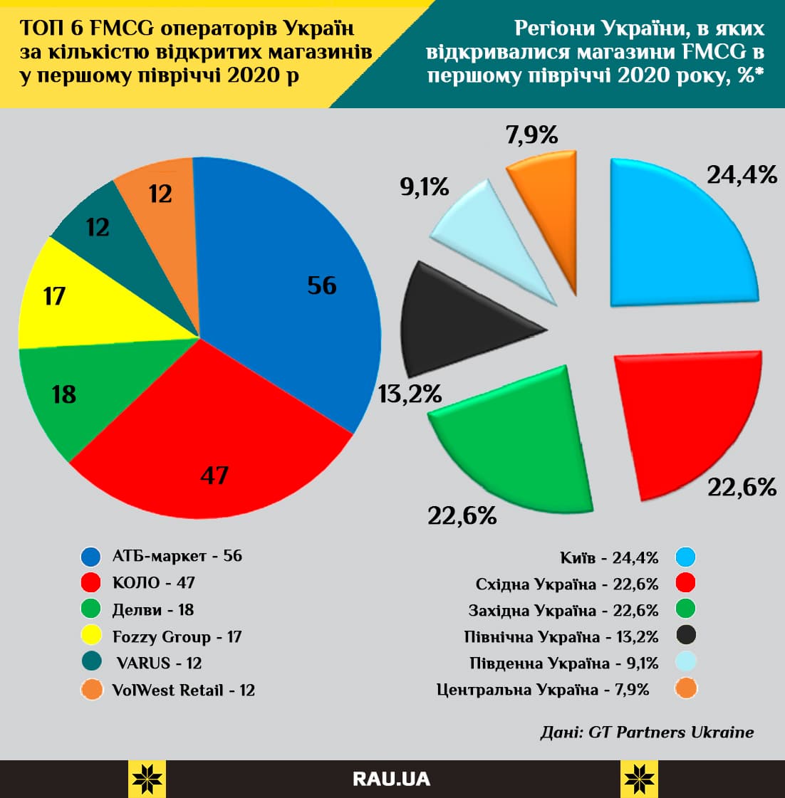 Исследовательская компания GT Partners Ukraine презентовала свое очередное исследование «Топ-160 торговых операторов FMCG по количеству магазинов, первая половина 2020-го». В отчете проанализировали: кто из ритейлеров и где открывает новые торговые точки, какие форматы магазинов наиболее популярны, на что делает ставку тот или иной всеукраинский или региональный игрок.