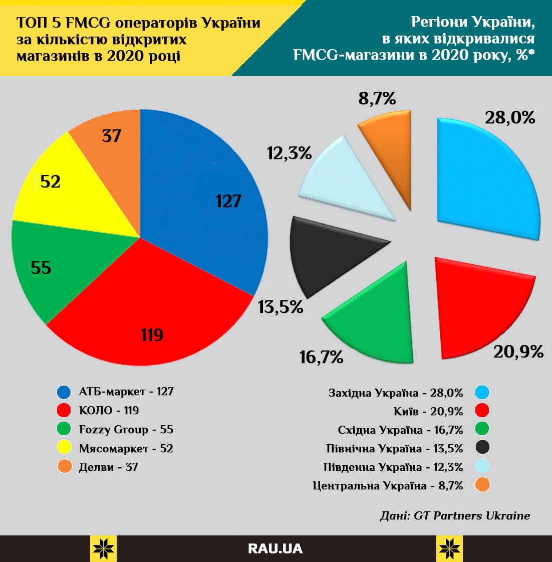Западная Украина (Волынская, Ровенская, Тернопольская, Львовская, Ивано-Франковская, Хмельницкая, Черновицкая, Закарпатская области) сумела сохранить статус самого привлекательного региона для открытия продуктовых магазинов, особенно для общенациональных игроков. Здесь состоялась почти треть всех открытий. На втором месте — столичный регион, который лидировал по итогам первого полугодия 2020-го. В Киеве открылось 20,9% новых FMCG магазинов.