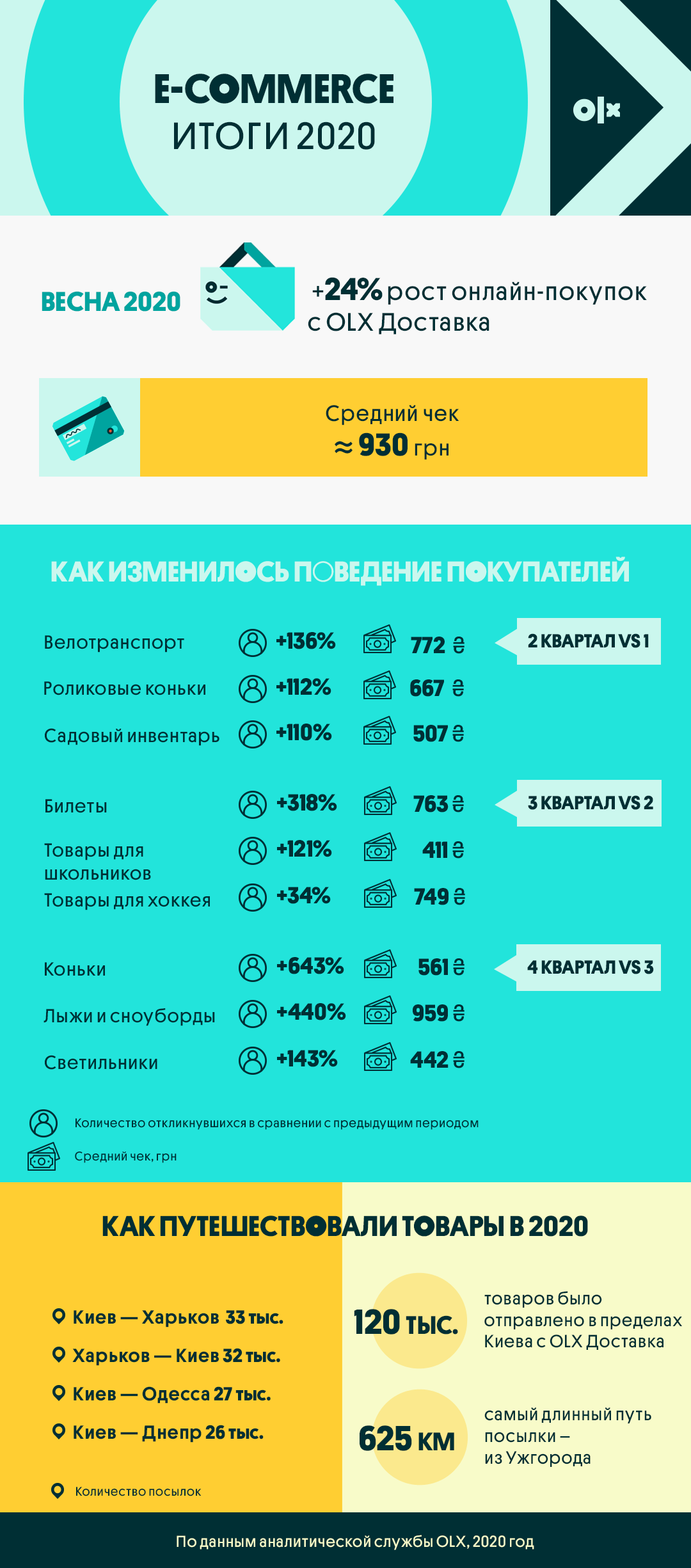 Средний чек покупок за год составил 930 грн, а больше всего доставок товаров в Украине было в пределах Киева. Больше о тенденциях покупок украинцев онлайн в 2020 — в исследовании OLX.
