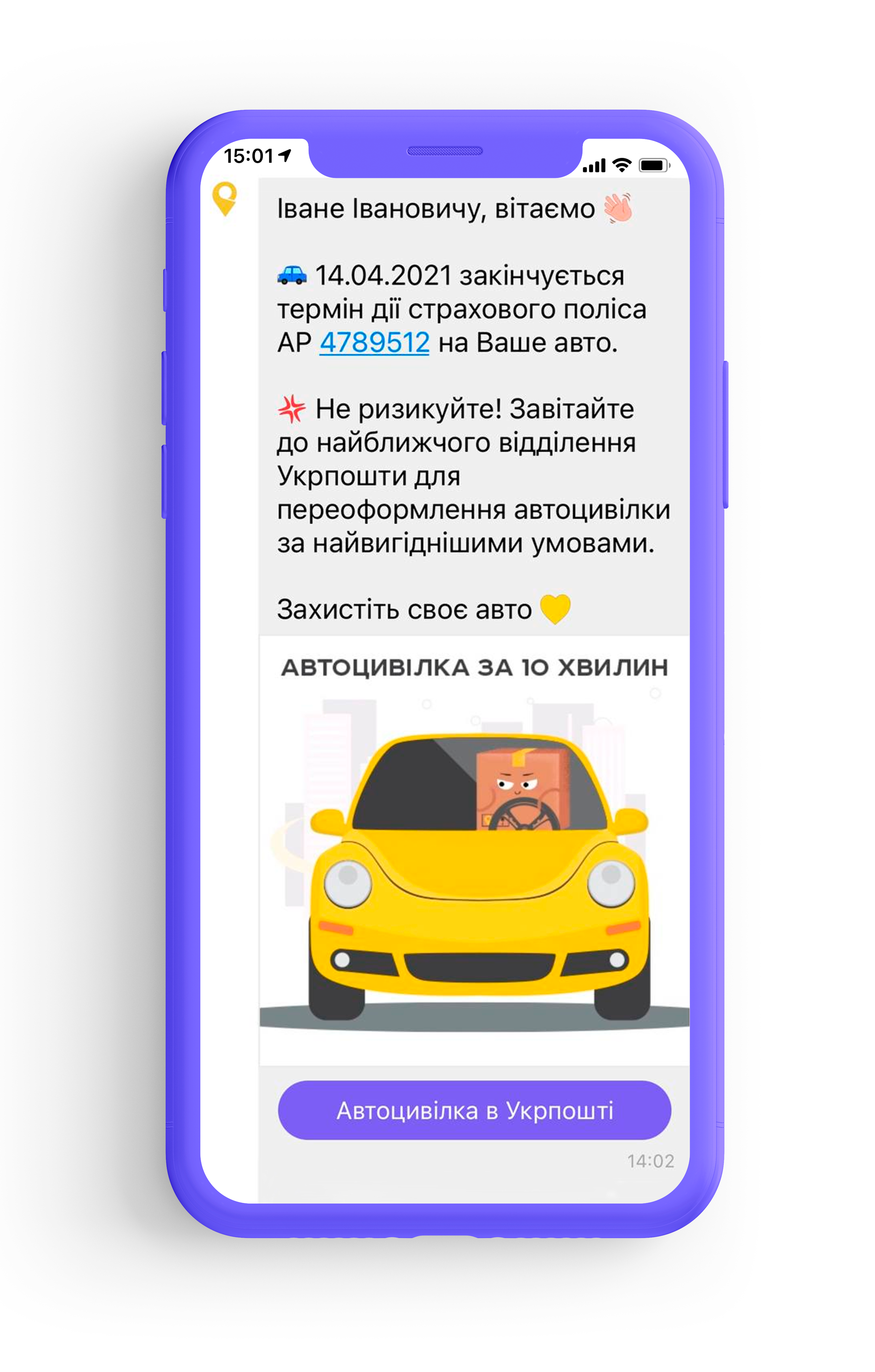 Укрпочта использует Viber-рассылки и в других кампаниях. Так, например, компания отправляет напоминания пользователям в Viber об окончании страховки. Для персонализации сообщений используют функцию переменных значений: в сообщение подставляется имя пользователя, номер договора и дата окончания страховки. Также для привлечения аудитории к заказам через интернет-магазины Укрпочта запускает рассылки с конкурсами и праздничными акциями.