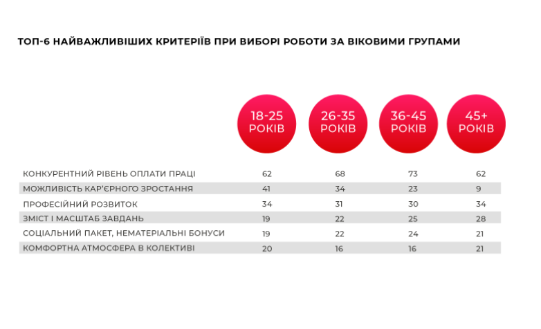 Абсолютным лидером при выборе предложения работы является фактор уровня конкурентной оплаты труда (68%). Этот фактор лидирует во всех областях, а больше всего в Восточном регионе, среди всех категорий соискателей — независимо от возраста, профессионального опыта и пола. Вторую позицию среди критериев выбора работы занимает возможность карьерного роста и профессиональное развитие. На третьем и четвертом месте находятся такие факторы, как суть и масштаб задач, социальный пакет и нематериальные бонусы.
