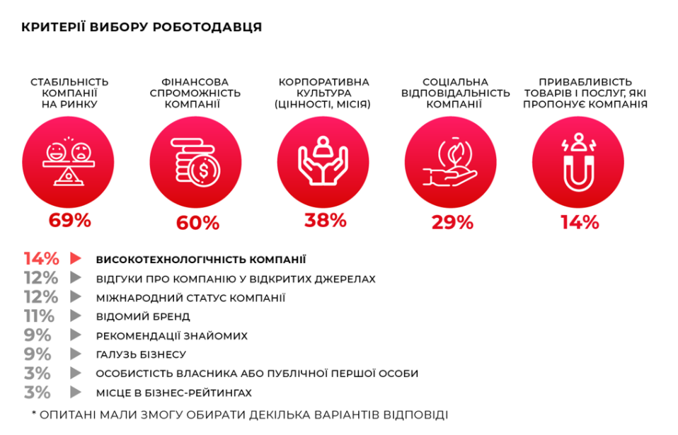 По результатам опроса, наиболее важными при выборе компании-работодателя во времена New Normal являются следующие факторы: стабильность компании на рынке (69%), финансовая состоятельность компании (60%) и корпоративная культура (38%). Эти факторы доминируют абсолютно во всех регионах и возрастных группах. Также важным критерием для кандидатов является социально-ответственная позиция компании (29%).