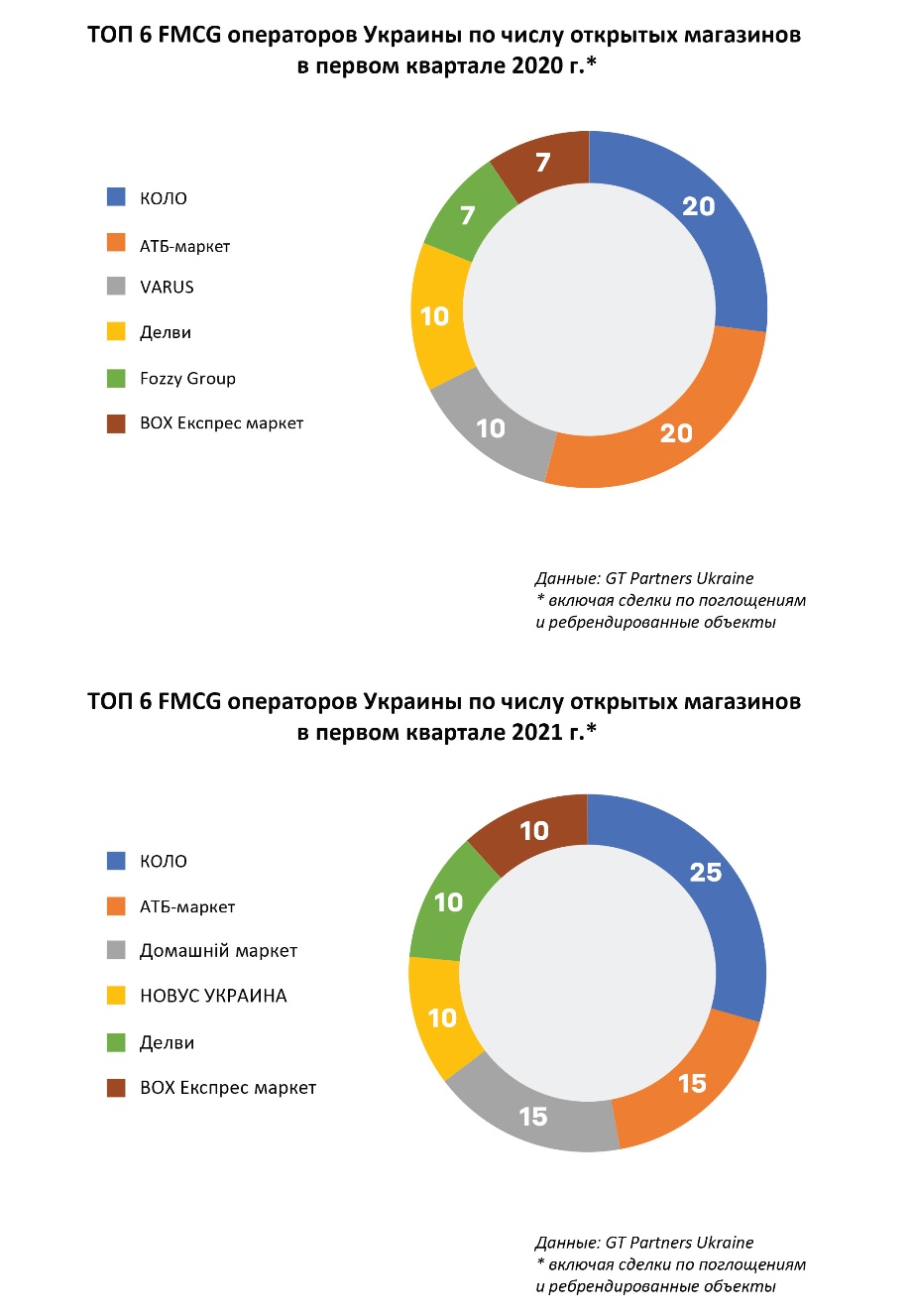 В целом, по сравнению с прошлым годом, рейтинг ТОП-6 FMCG-операторов Украины по числу открытий в первом квартале 2021 года изменился несущественно. Сети КОЛО и АТБ продолжают возглавлять список лидеров, запуская почти одинаковое количество магазинов. Изменения произошли, разве что во второй троице компаний-лидеров. Так, в нынешний период среди ТОПа появились «НОВУС Украина» и «Домашній маркет», которых не было в прошлом году.