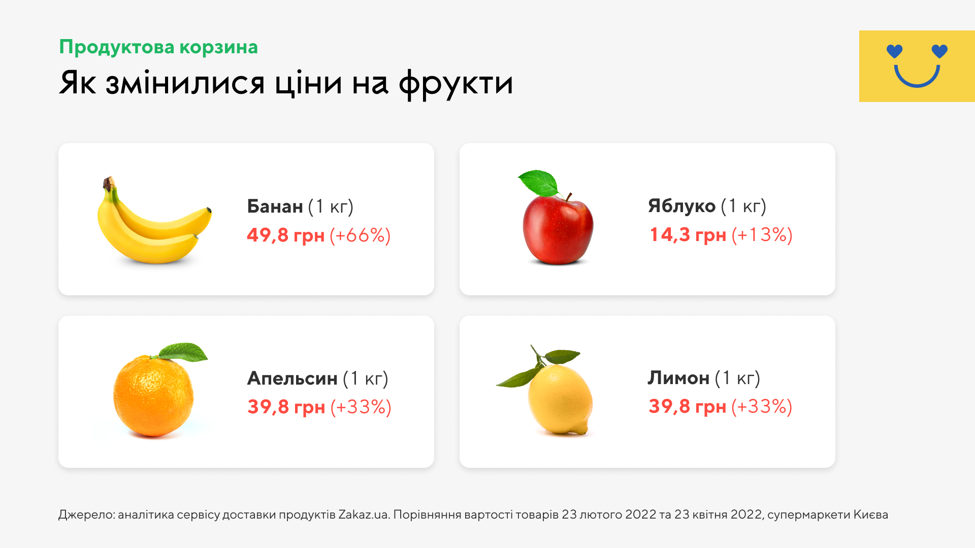 Сервис доставки продуктов Zakaz.ua проанализировал, как изменились цены на продукты питания в украинских супермаркетах в течение двух месяцев войны по сравнению с довоенным периодом. Подорожание постигло почти все потребительские товары повседневного спроса из продуктовой корзины украинца. Больше всего возросла цена на бананы, помидоры, цитрусовые и сахар.