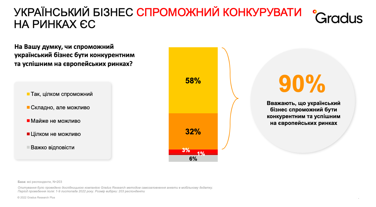 90% предпринимателей считают, что украинский бизнес может быть конкурентным и успешным на европейских рынках.
