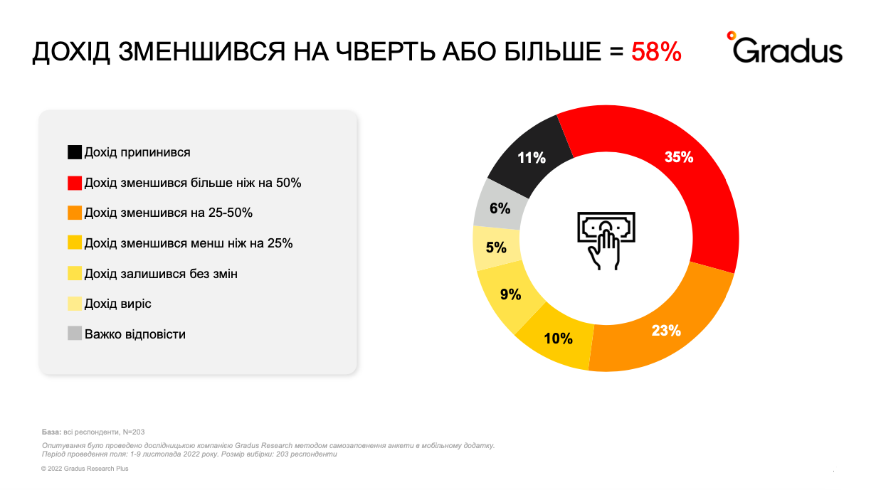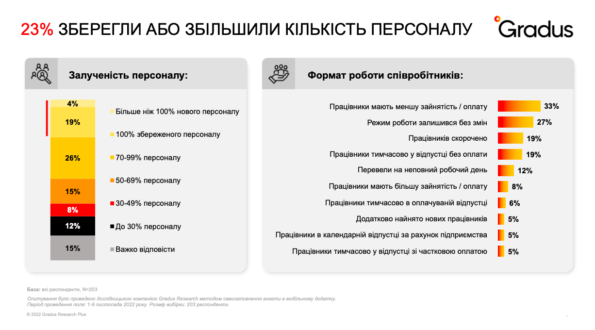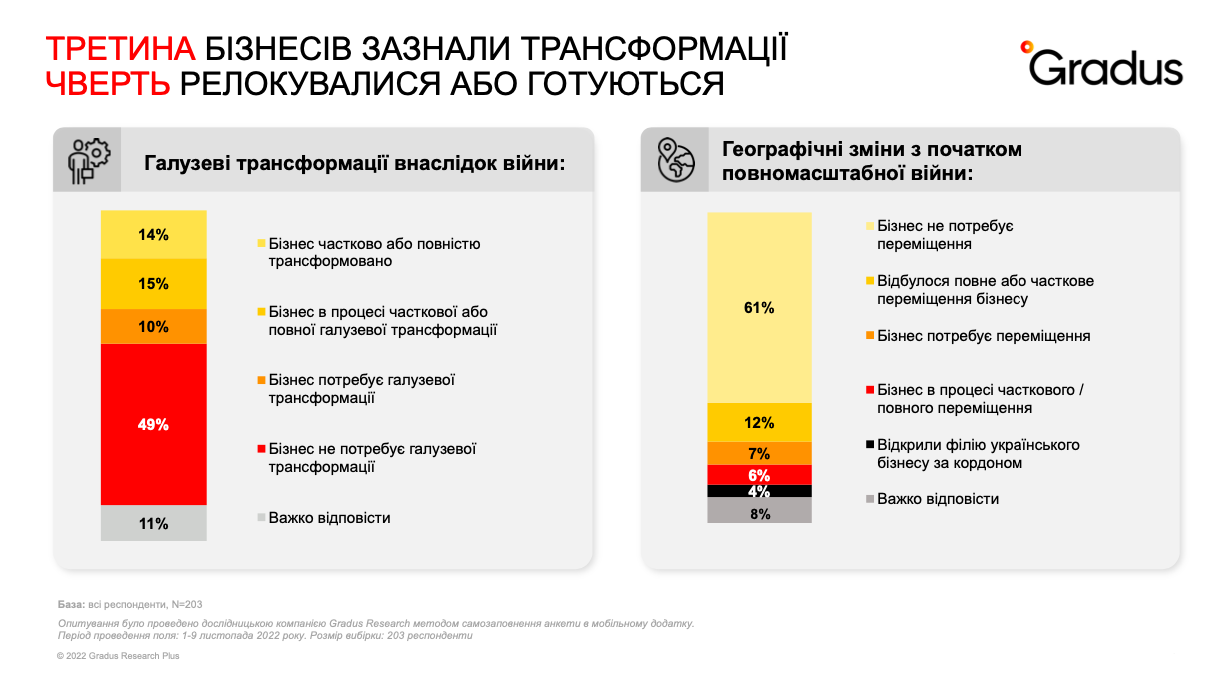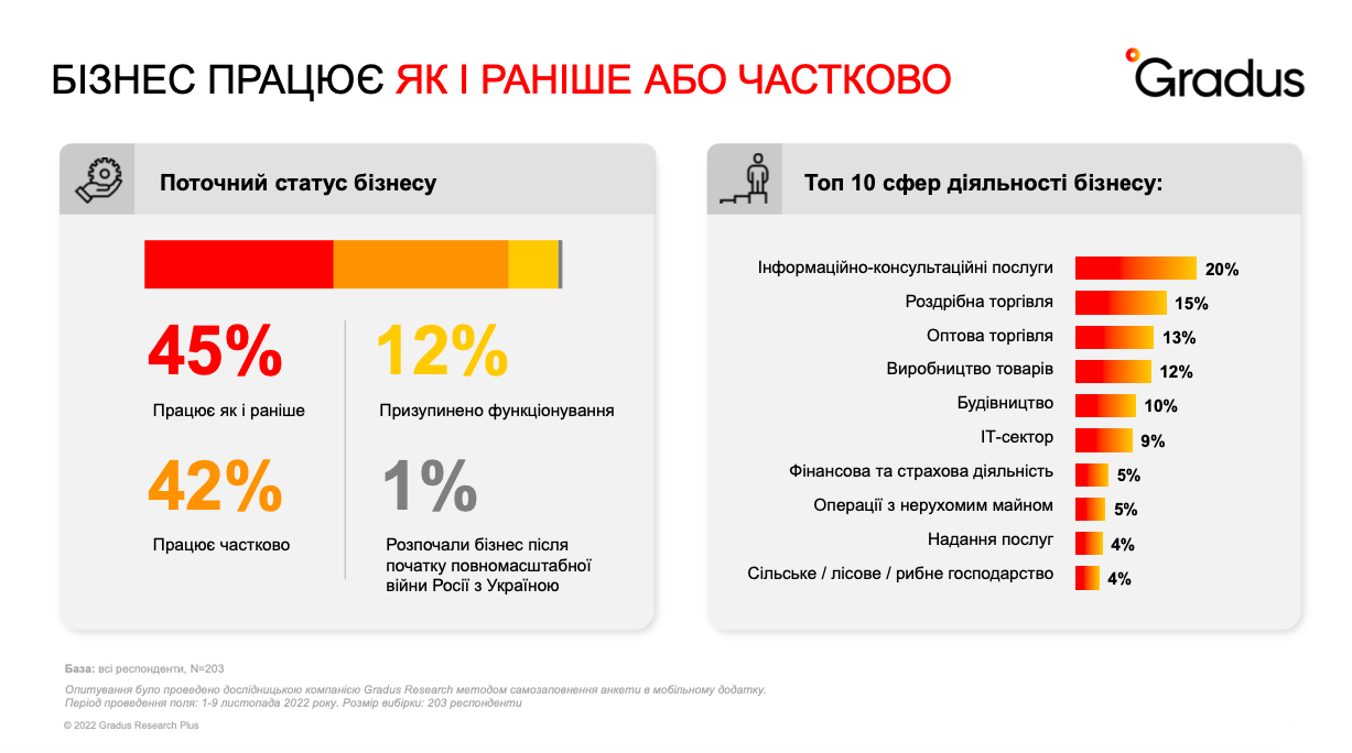 Специально для Киевского Международного Экономического Форума (КМЭФ) исследовательская компания Gradus Research в начале ноября 2022 года провела опрос малого, среднего и крупного украинского бизнеса, в котором приняли участие 203 компании.