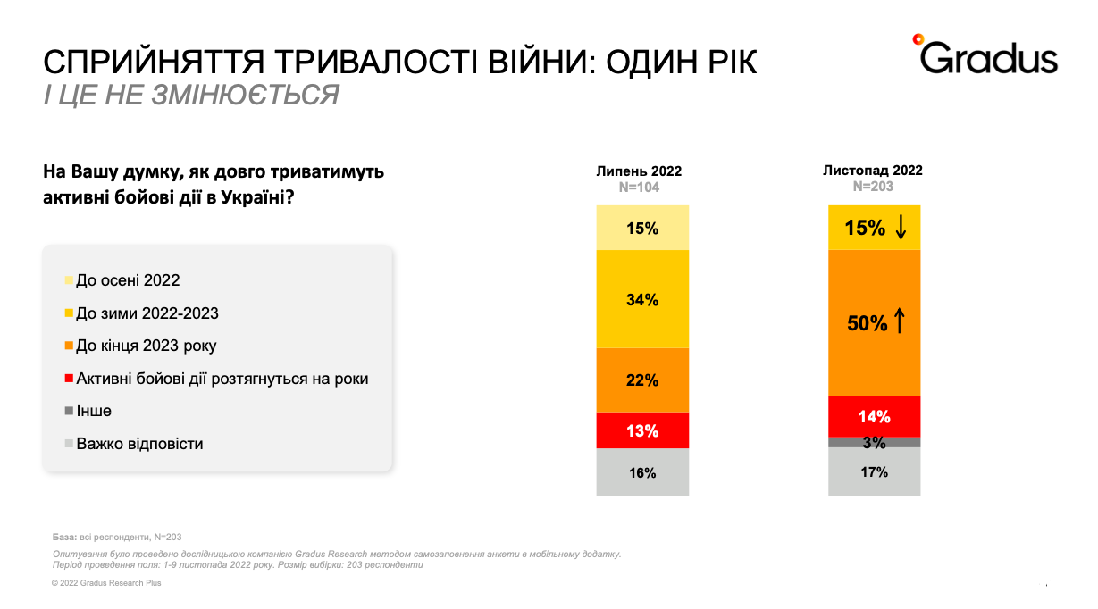 По мнению 50% опрошенных членов украинского бизнес-сообщества, активные боевые действия в Украине будут продолжаться до конца 2023 года.