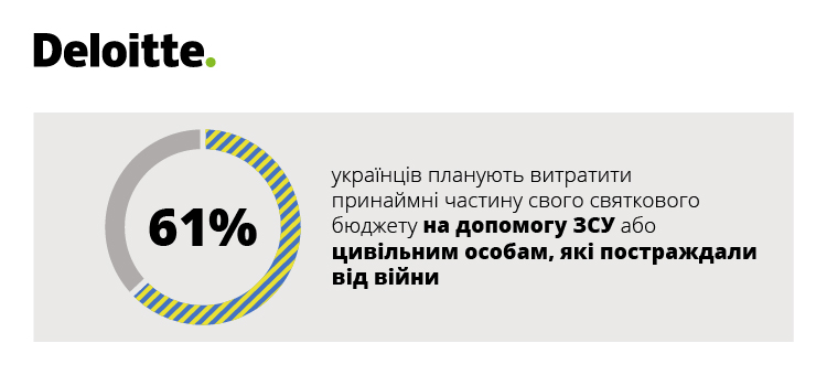 - Не забывают поблагодарить защитников. Более 60% украинцев хотя бы часть своего бюджета на новогодний и рождественский шопинг потратят на помощь ВСУ или пострадавшим от войны.