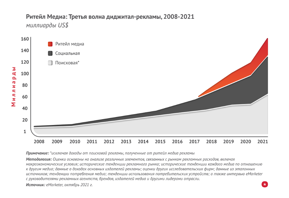 Ритейл медиа — один из наиболее важных элементов будущего роста программатик-рекламы. Уже сегодня этот рекламный канал развивается с огромной скоростью. Согласно eMarketer, в 2021 объем затрат на рекламу именно на этой рекламной площадке составил почти 24 млрд долларов и продолжает расти.