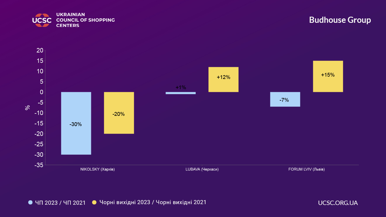 Но если сравнивать недели, то показатели совсем другие, так, у Forum Lviv и Lubava посещаемость за неделю выросла на 15% и 12% соответственно по сравнению с 2021 годом. В Харькове показатели Черной недели 2023 года не достигли результатов недели 2021-го (-20%), но это больше связано с тем, что трафик Nikolsky еще до конца не возобновился, да и тревоги занимают в Харькове гораздо больше времени.