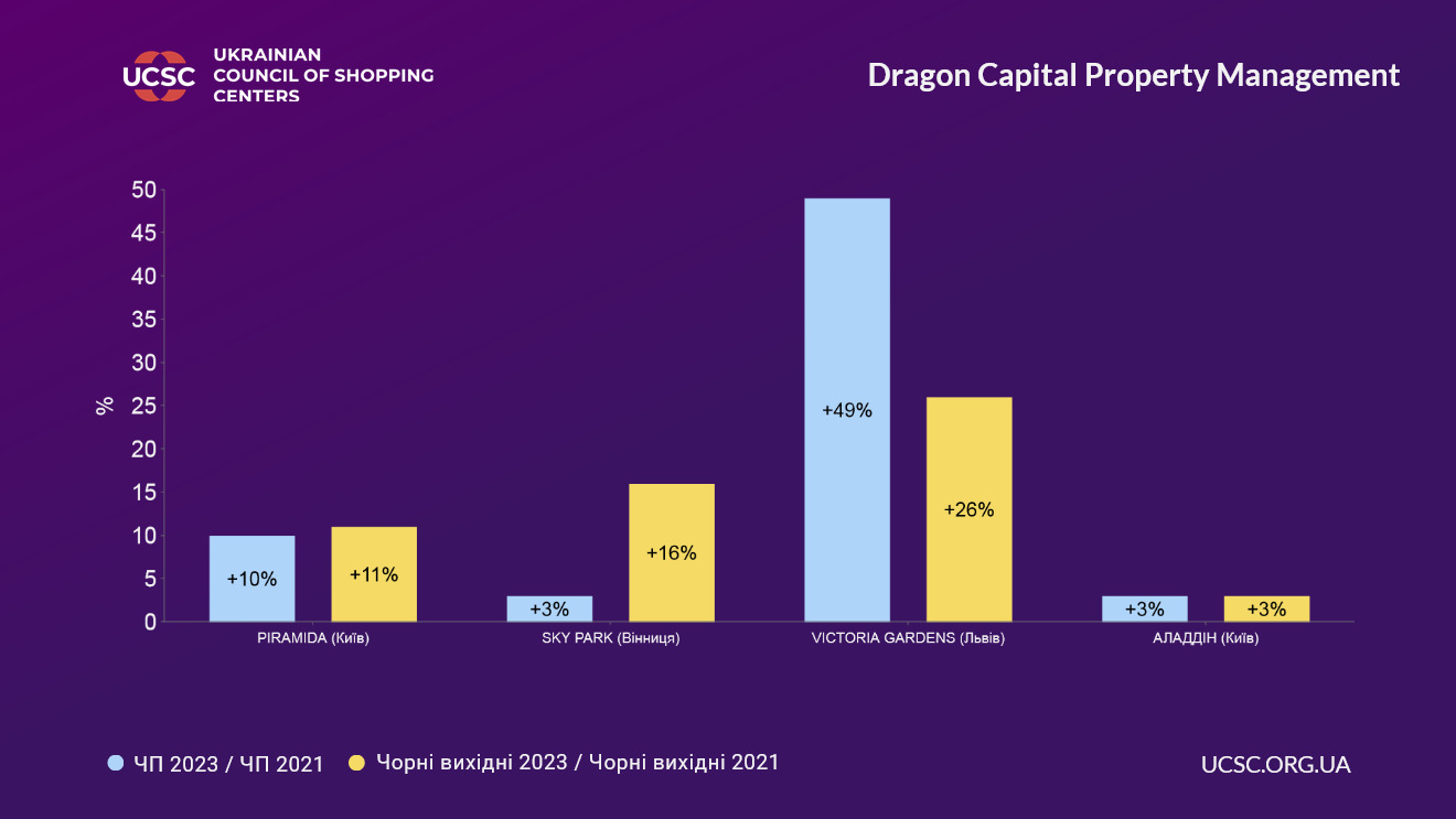 - Victoria Gardens Львов: ЧП 2023/2021+49%, выходные 2023/2021+26%.