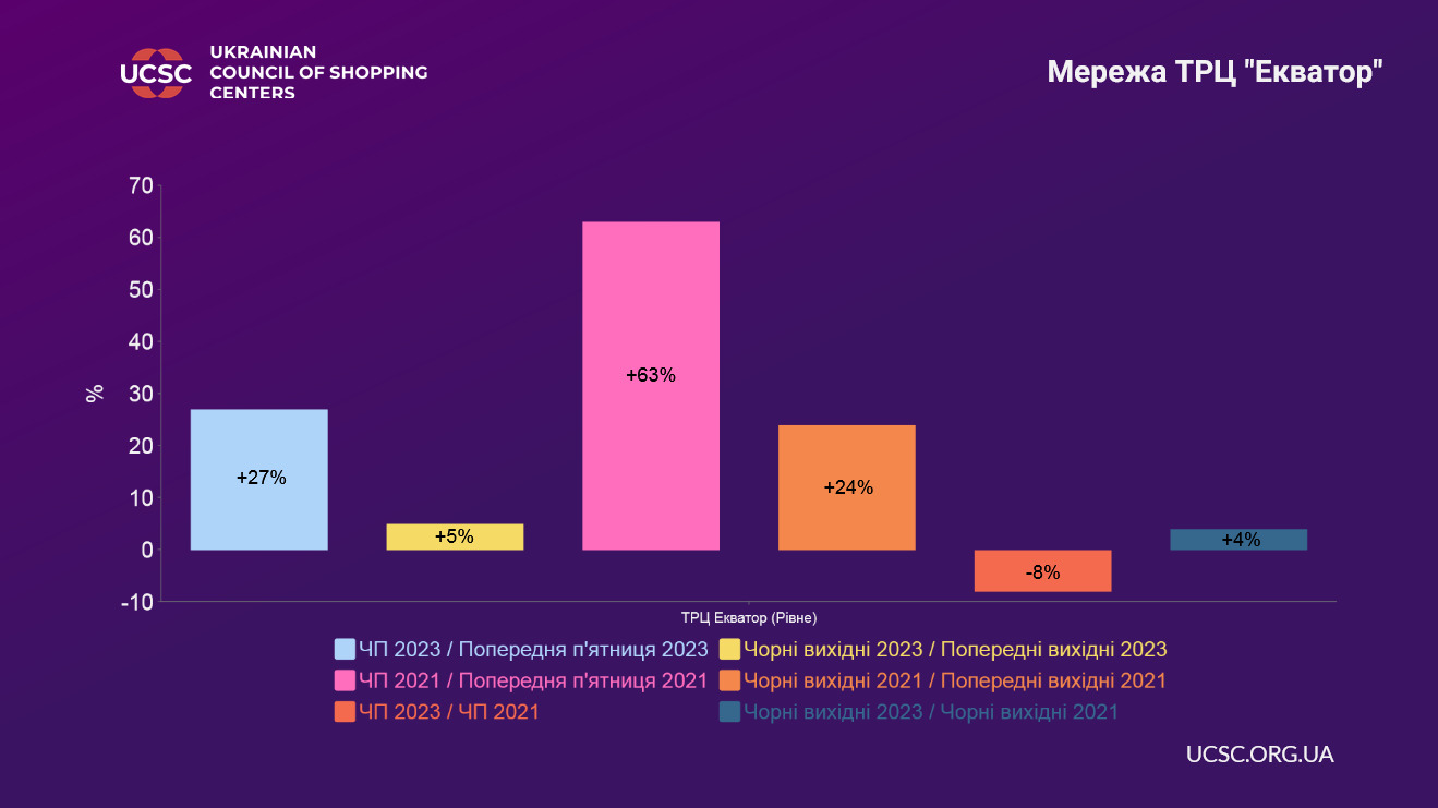 «В этом году в большинстве магазинов ТРЦ «Экватор» Черная пятница длилась более 2 недель. Как это отразилось на трафике? Безусловно, повысило трафик не только в Черную пятницу, ведь посетителей привлекали скидки в течение всего периода. Покупатели смогли запланировать посещение ТРЦ на предыдущую субботу и воскресенье, таким образом сняв свои опасения, такие как нехватка времени, вероятность временной приостановки работы магазинов в связи с воздушной тревогой или дефицита размеров и определенных товаров», — говорит руководитель отдела маркетинга ТРЦ "Экватор«.