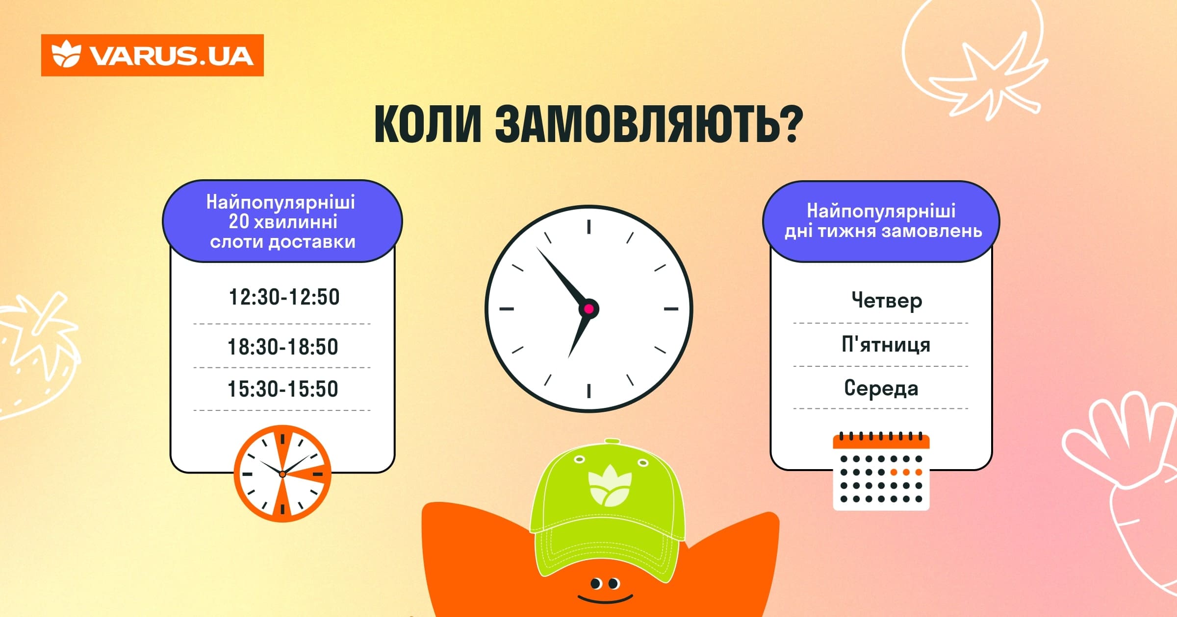 Если говорить о времени доставки, можно проследить определенную тенденцию. Чтобы точно спланировать встречу с курьером, следует выбрать удобный 20-минутный интервал доставки. «Золотыми» в графике доставки являются такие 20 минутные слоты.