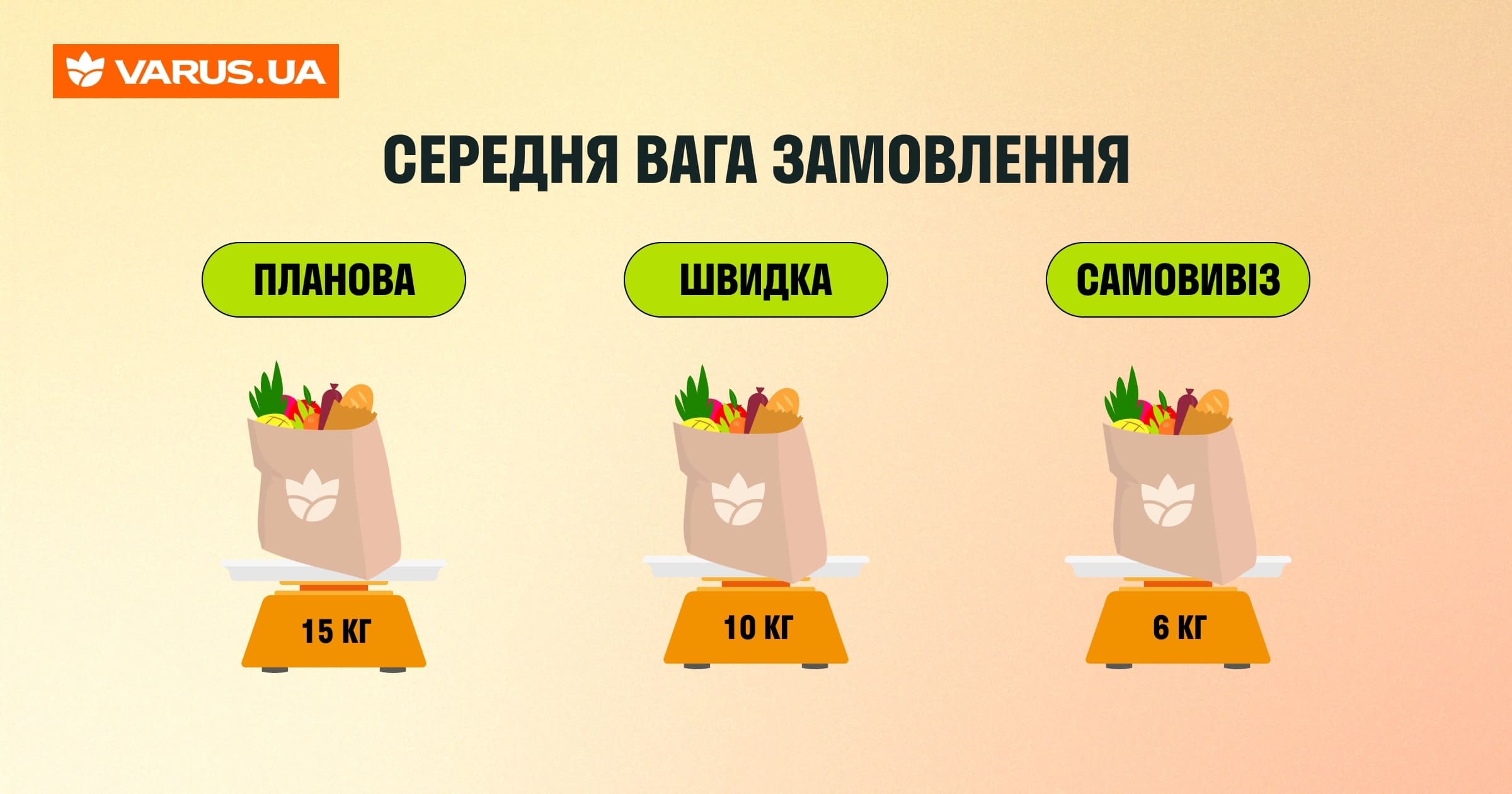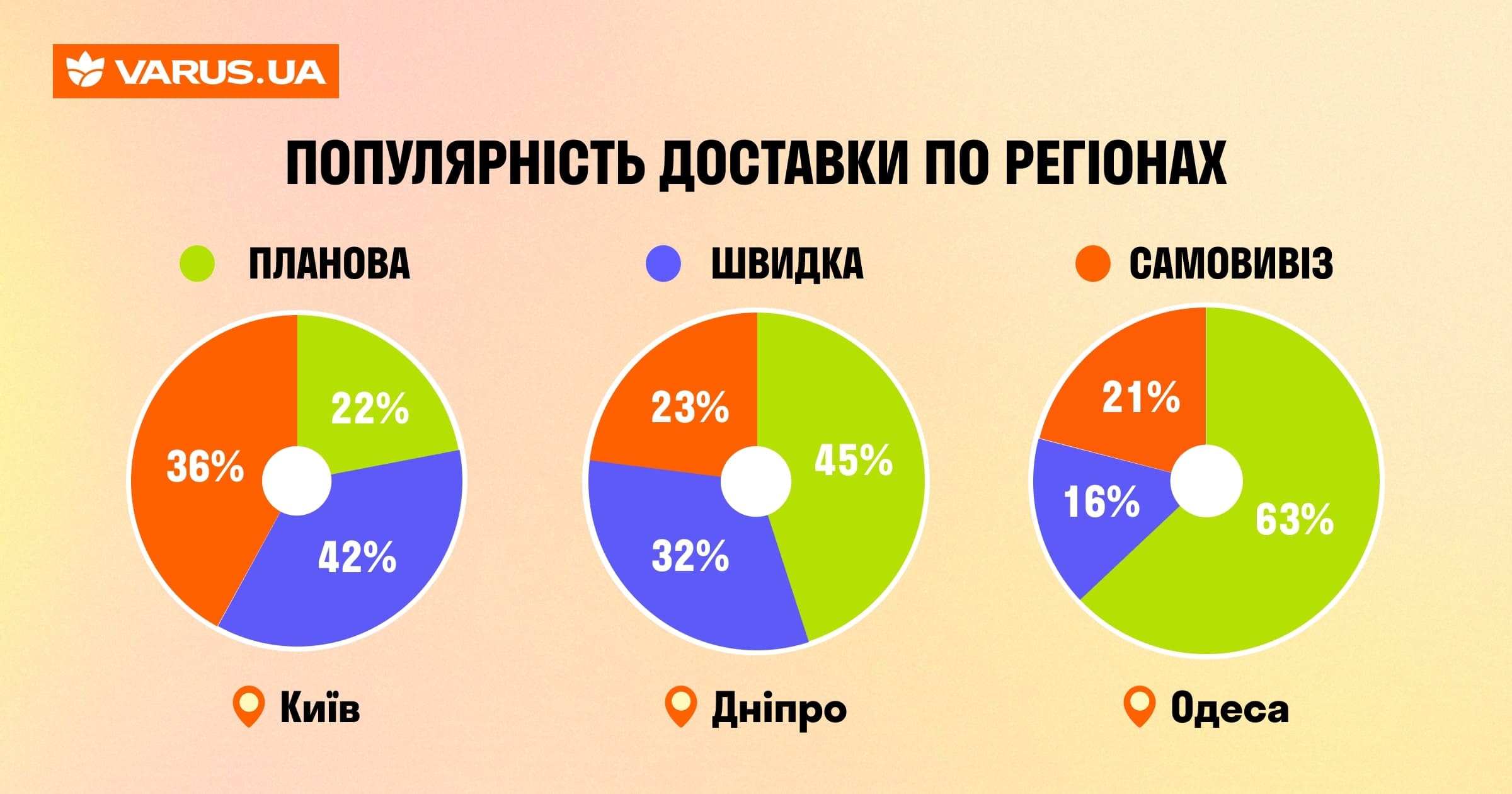 Услуга доставки распространяется на любой товар, представленный на сайте www.varus.ua. Для разных форматов доставки прослеживаются собственные тенденции по объему заказов. Наибольшее количество позиций обычно заказывают планово. Наименьшее, соответственно, когда выбирают опцию самовывоза.