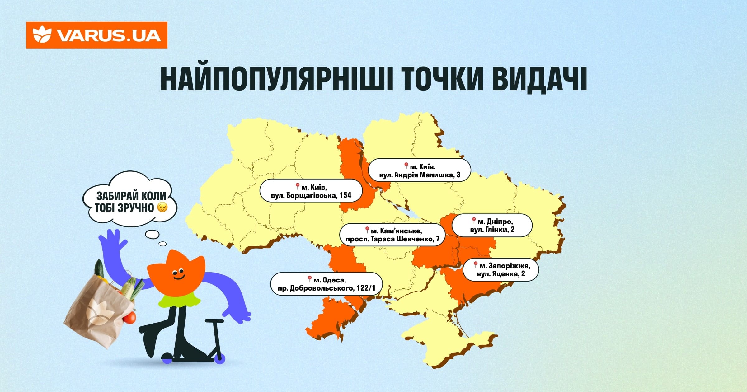 Поскольку на выбор клиентов влияет ряд обстоятельств, как близость супермаркета к дому, график работы и т.п., то не удивляет, что у каждого магазина есть собственная статистика. Среди всех маркетов сети VARUS можно выделить самые популярные точки, из которых заказывают доставку: