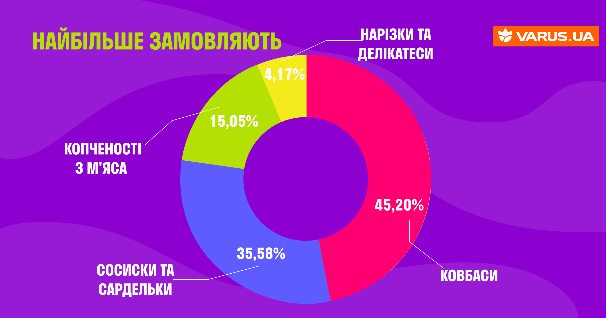 Лидерами среди вкусов украинцев этой весной стали колбасы и мясные деликатесы. Согласно аналитическим данным VARUS.UA, среди самых популярных категорий продуктов выделяются колбасы, составляющие 45,20% от общего объема заказов. На втором месте находятся сосиски и сардельки с показателем 35,58%. Копчености из мяса занимают 15,05% заказов, а нарезки и деликатесы — 4,17%.