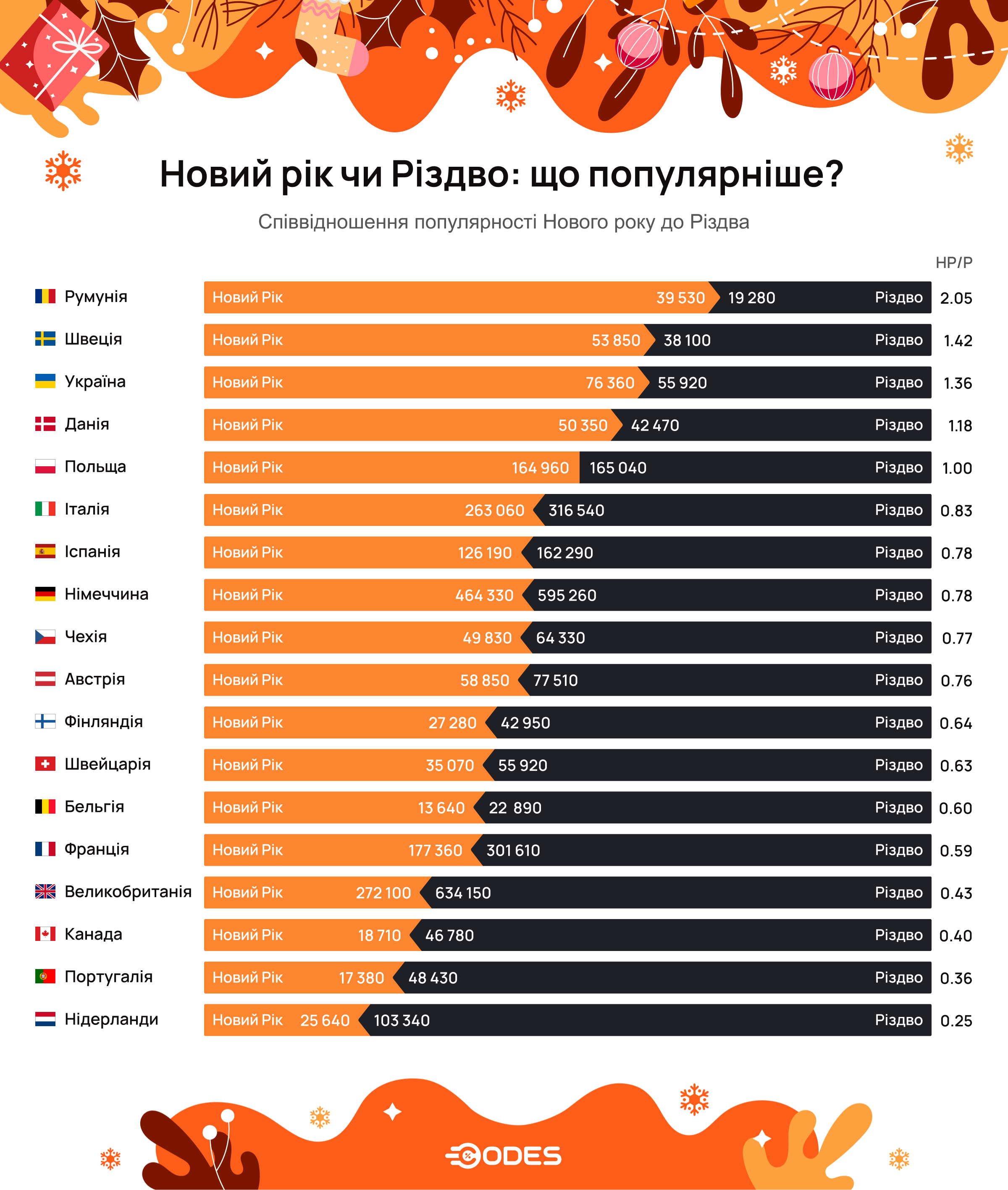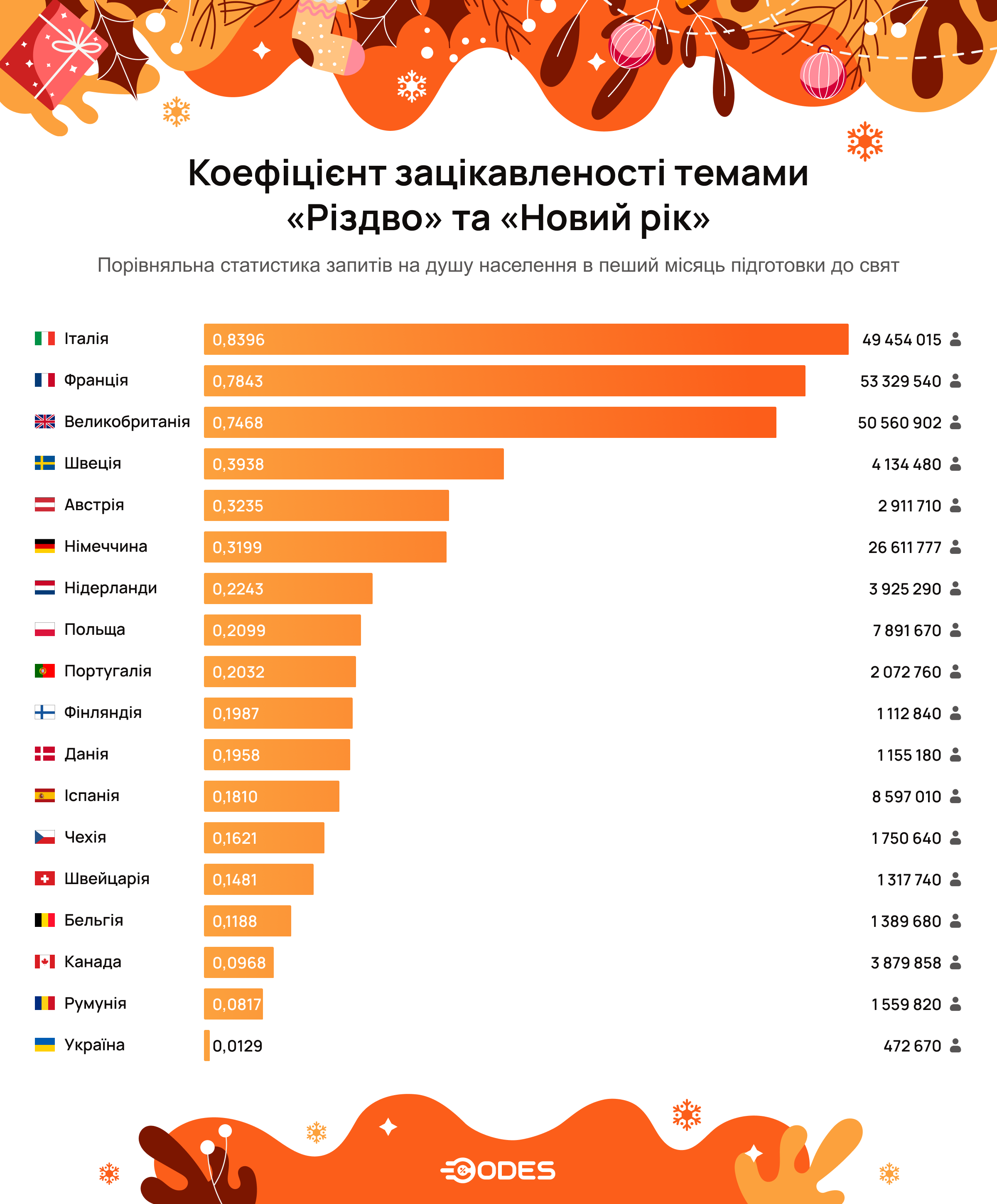В ноябре 2024 года было проведено исследование поисковых запросов на предпраздничную тематику в разных странах, и вычислено соотношение интересующихся праздниками с общим количеством населения. Тщательный анализ его результатов показал, что мы откровенно отстаем в этом вопросе. Конечно, следует учесть тот факт, что ранее православные украинцы праздновали Рождество 7 января.