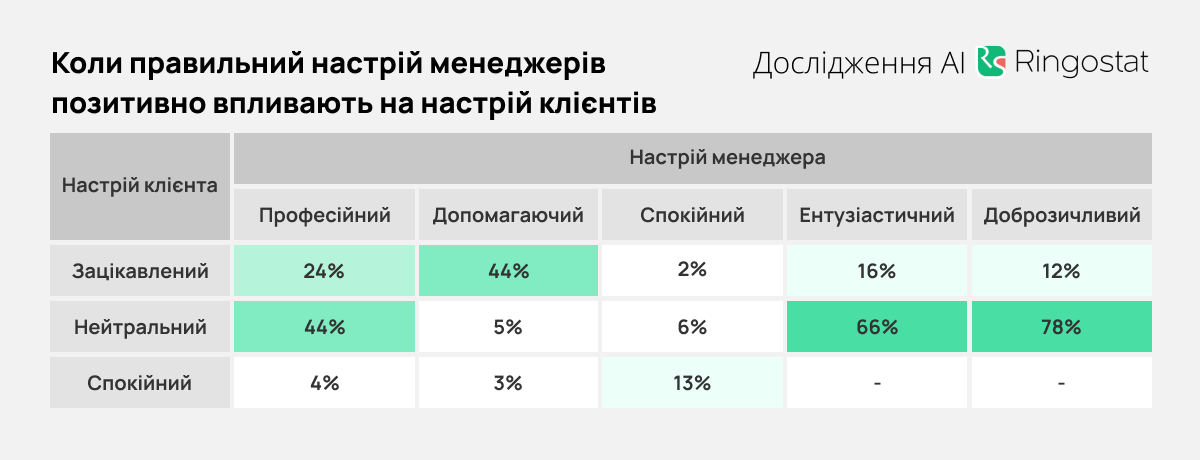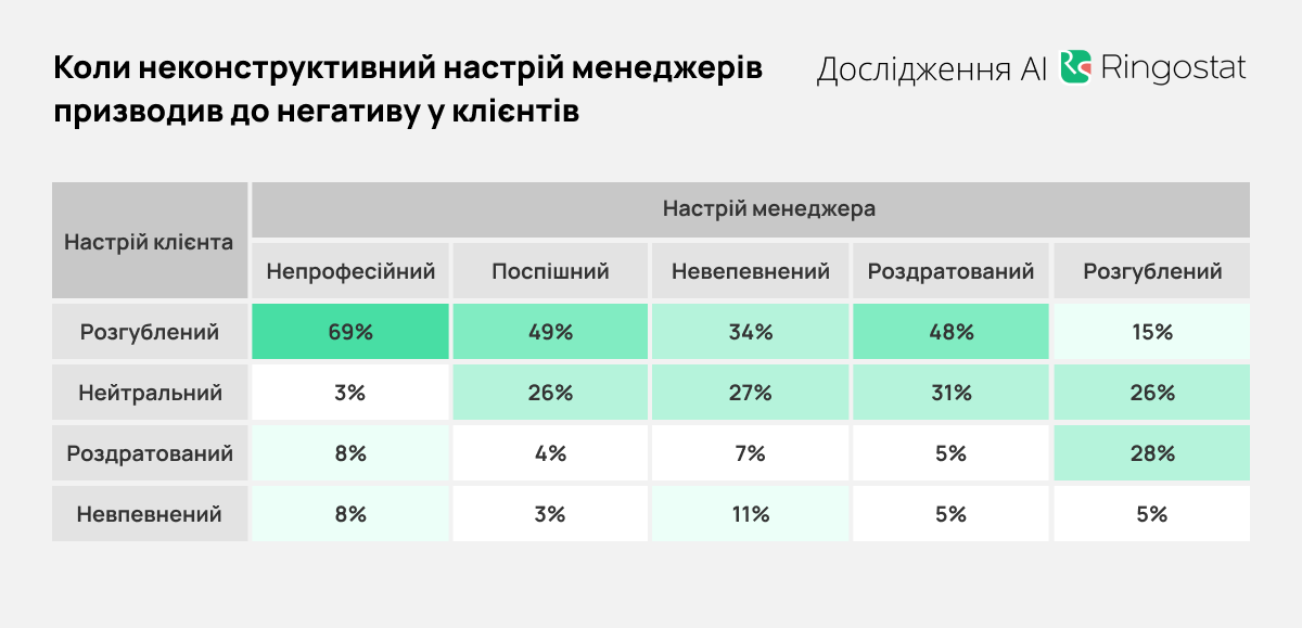 Также Ringostat, благодаря искусственной модели Claude A, проанализировали влияние настроения менеджеров на настроение клиентов. В таблицах ниже показано, как часто настроение менеджера совпадало с определенным настроением клиента. В колонках показан % всех случаев, когда у работника было конкретное настроение.