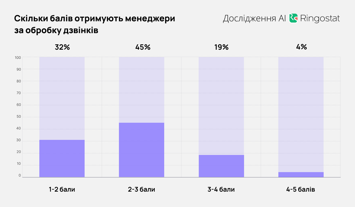 Анализ звонков с помощью ИИ включает общую оценку диалога. Она состоит из оценки за каждый этап типичного разговора: открытие, выявление потребностей, презентация товаров и компании, завершение диалога. имеют оценку 3 и ниже, а оценку 5 получили всего 1% диалогов.