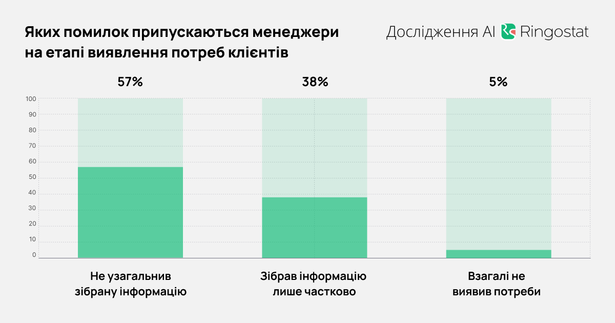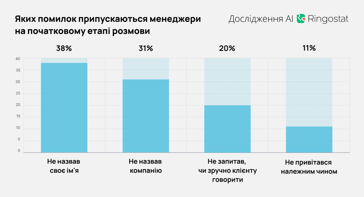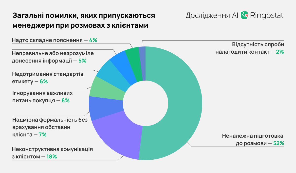 - Более половины общих ошибок — недостаточная подготовка менеджера к разговору.