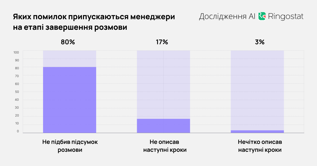 - в 17% случаев менеджеры не озвучивали следующие шаги, которые должны предпринять они или клиенты;