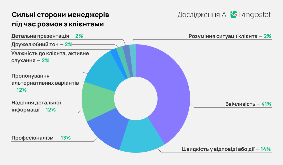 AI выявил и положительные моменты при анализе разговоров. В 41% случаев менеджеры были вежливыми, в 14% — демонстрировали скорость ответа или действия, в 13% — профессионализм и т.д. Однако только у 2% диалогов реже случались случаи внимательности для клиента, понимание его ситуации, дружелюбие и умение делать детальную презентацию.
