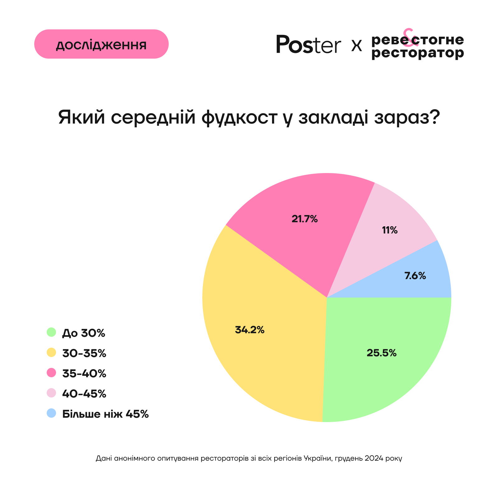 34% опрошенных рестораторов отметили, что работают с фудкостом 30-35%. Только четверть имела фудкост до 30%.