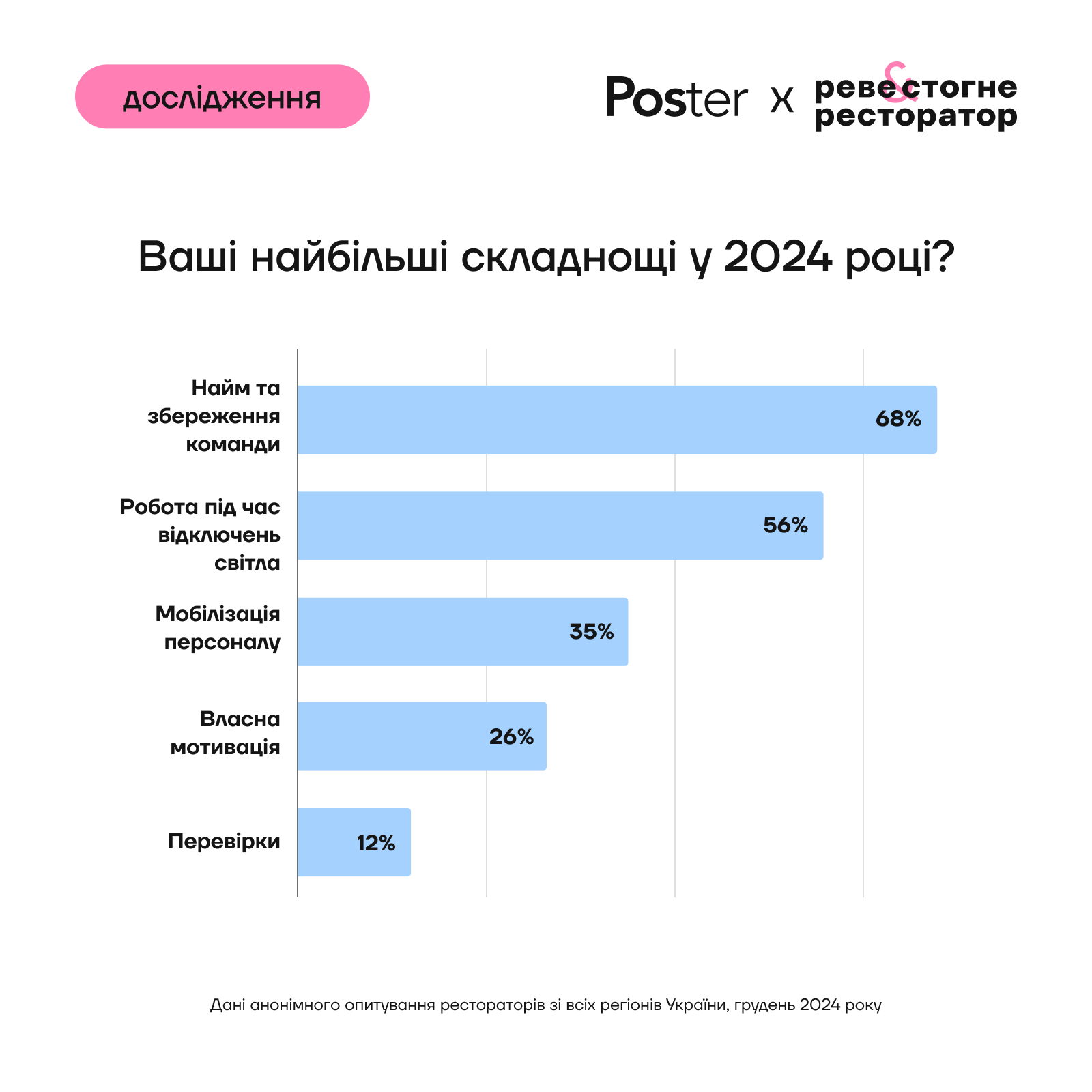 Сложнее всего рестораторам в 2024 году было нанимать и удерживать команды и работать при отключении света. Кроме того, предпринимателей беспокоила мобилизация персонала, собственная мотивация работать и проверки бизнеса.