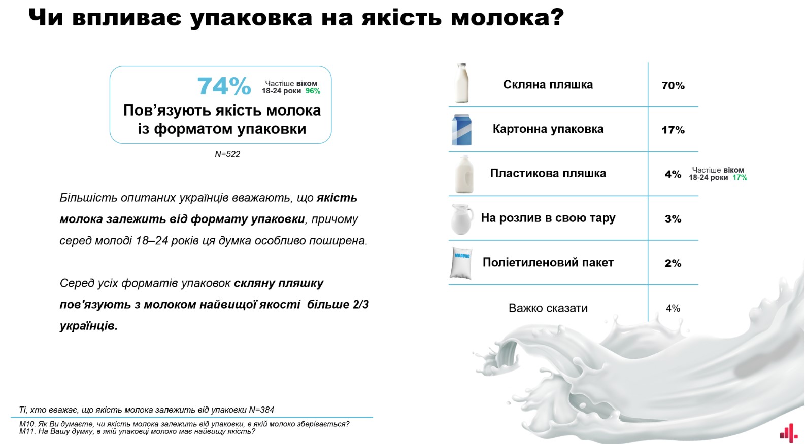 Для украинцев упаковка стала маркером качества: 74% потребителей считают, что от формата зависит свежесть и безопасность молока. Особенно это убеждение распространено среди молодежи 18-24 лет — почти 96% связывают качество с тарой.