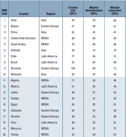 Примечетельно, что в данном рейтинге Россия поднялась с прошлого года на одну позицию и заняла 2-е место. Самой привлекательной страной для ритейлеров, по мнению экспертов A. T. Kearney, в этом году является Индия. Третий в списке перспективнейших рынков Китай. Тройка лидеров восстановила статус-кво, нарушенный в 2008 г. Вьетнамом, вырвавшимся на 1-е место благодаря буму на рынке торговой недвижимости. В этом году Вьетнам опустился на пять позиций — из-за высокой инфляции и серьезных проблем в экспортно-ориентированной экономике, указано в отчете по GRDI.