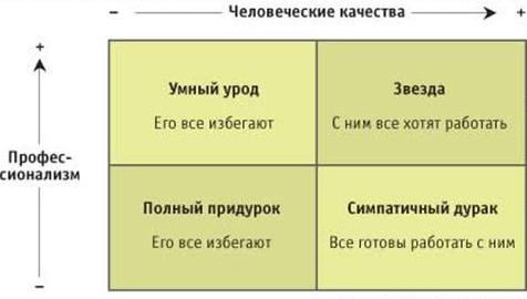 Сочетание этих двух критериев — профессионализма и характера — порождает четыре архетипа: «умный урод» (высококлассный специалист, но неприятный человек, которого избегают), «симпатичный дурак» (мало в чем сведущ, но человек хороший), «звезда» (опора и надежда компании — и человек замечательный, и профессионал отличный) и «полный придурок» (ну это объяснять не надо). Конечно, такое деление весьма условно. Как правило, компании стараются избавиться от профнепригодных или социально неадекватных людей. Но все равно по этому принципу можно классифицировать, хотя и грубо, сотрудников любой организации. (Попробуйте, и вам наверняка удастся заполнить именами своих коллег четыре пустых поля в таблице выше).