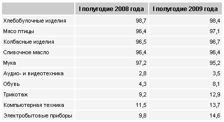 При этом если в предыдущие периоды доля непродовольственных товаров, включая автомобили и ювелирные изделия, в торговом обороте увеличивалась (в I полугодии 2008 года рост составил 2,4 процентных пункта), то за год их доля упала на 6,6 п. п. (до 60,5%). Продажи сократились на 11,55 млрд грн – до 60,38 млрд грн. "Традиционно рост доли непродовольственных товаров в структуре покупок граждан свидетельствует об увеличении их достатка.